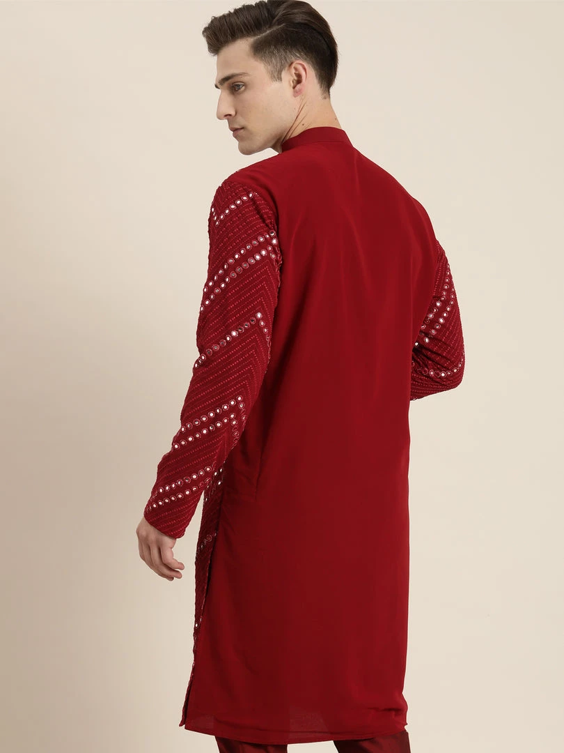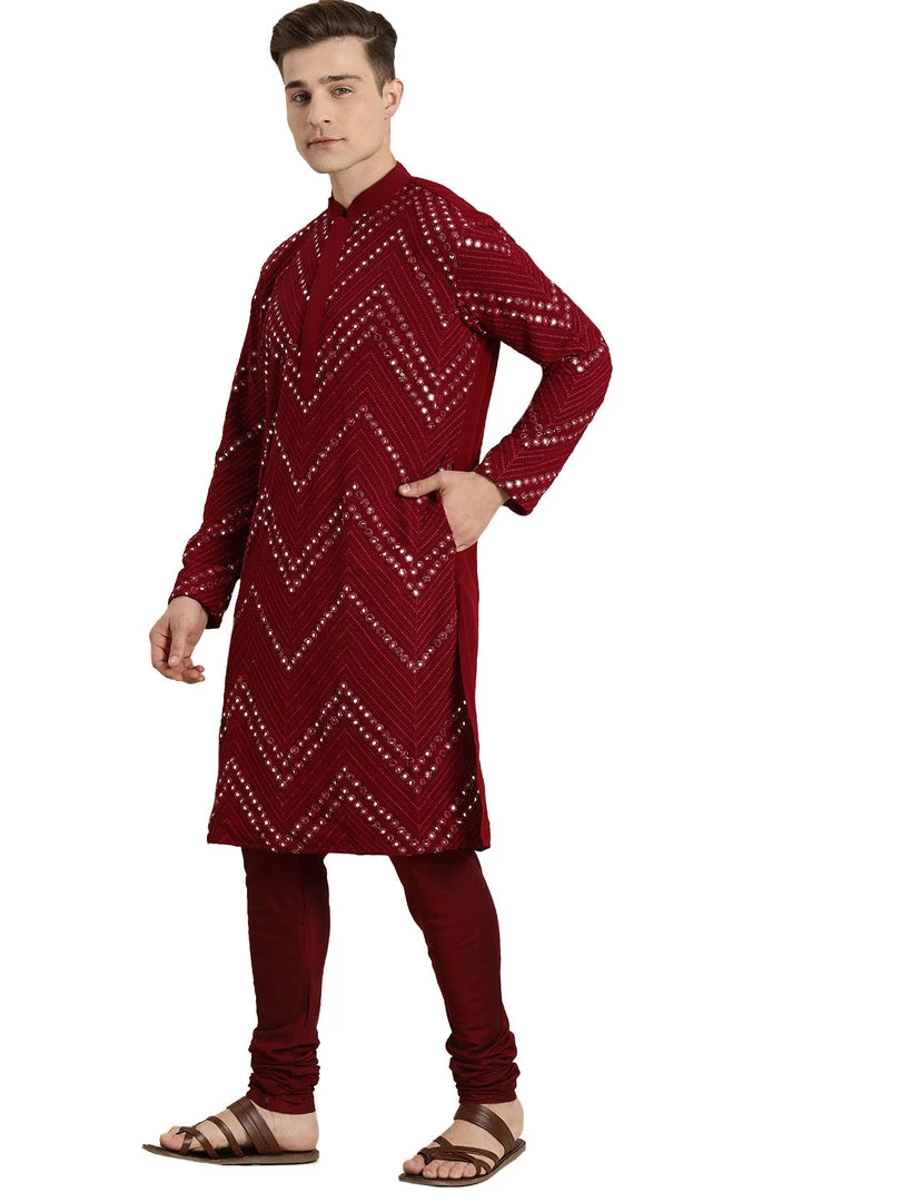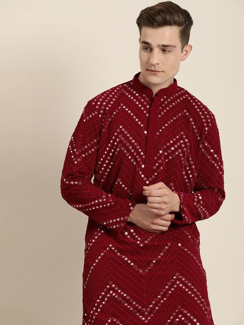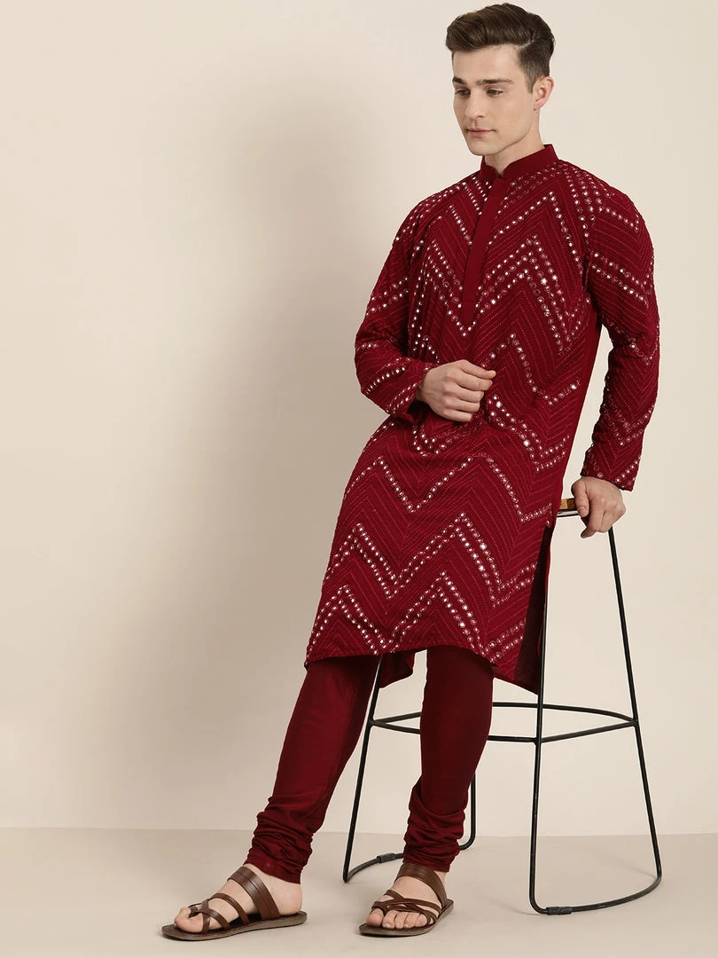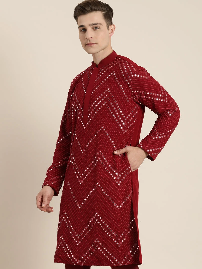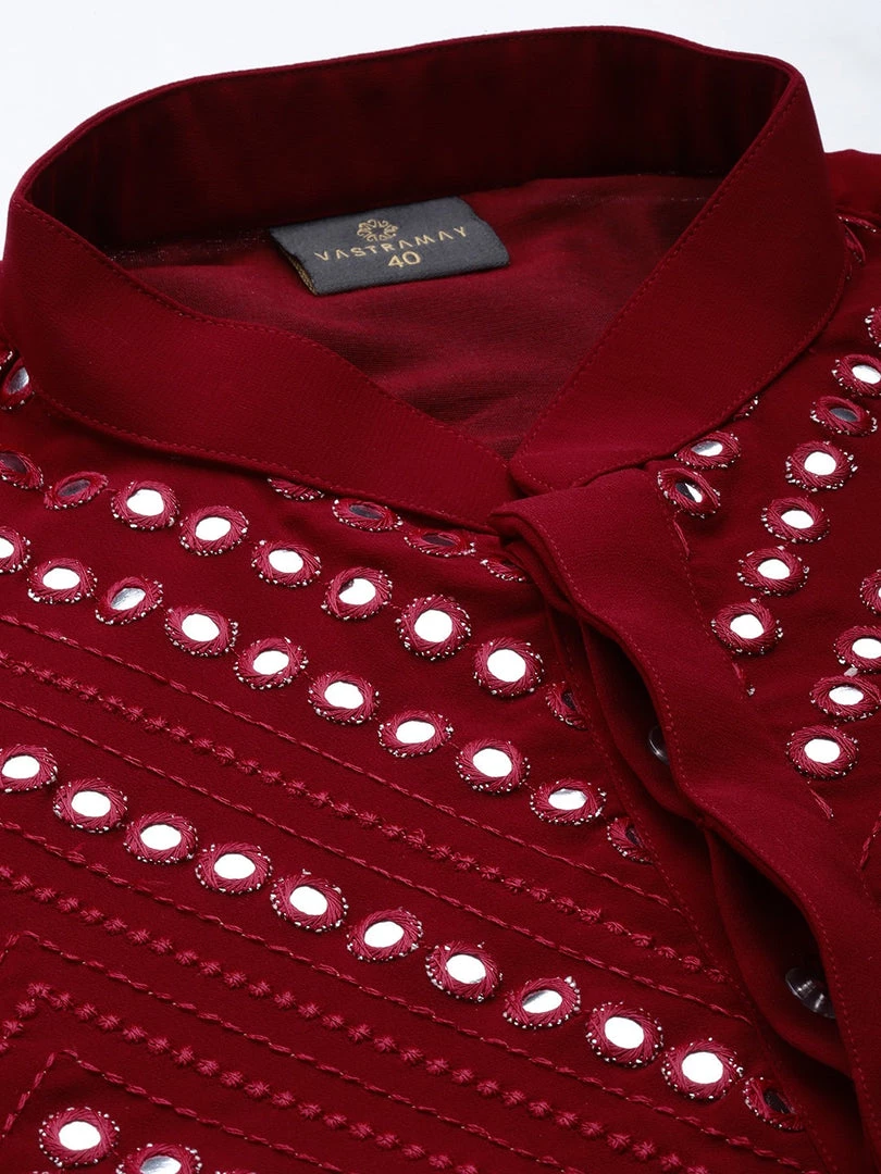 Maroon chevron embellished kurta has mandarin collar, long, regular sleeves, knee length with straight hem, mirror work and it also has straight shape with regular style.