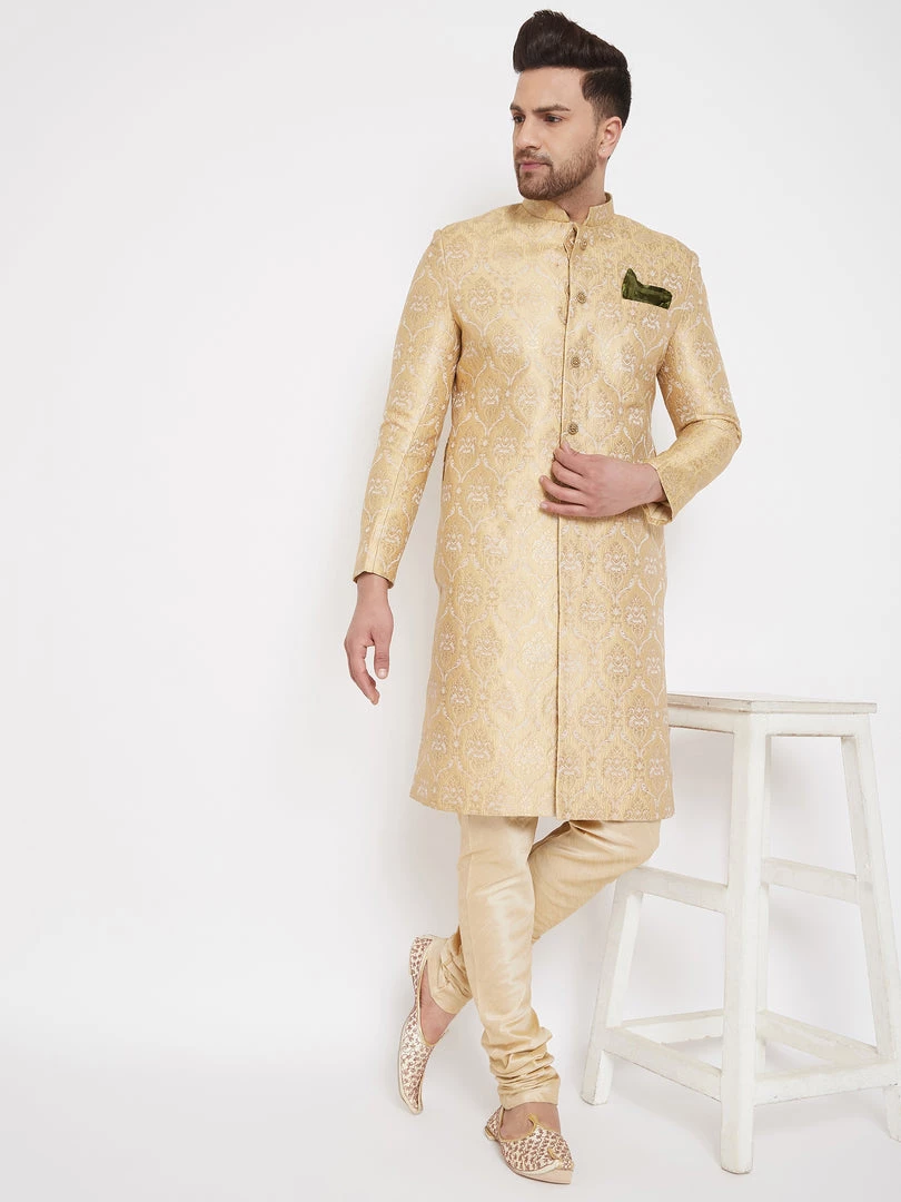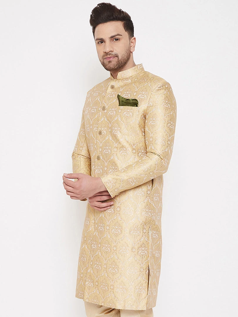 Gold solid coloured mandarin collar sherwani has long sleeves, full front button placket, straight hem, side slits