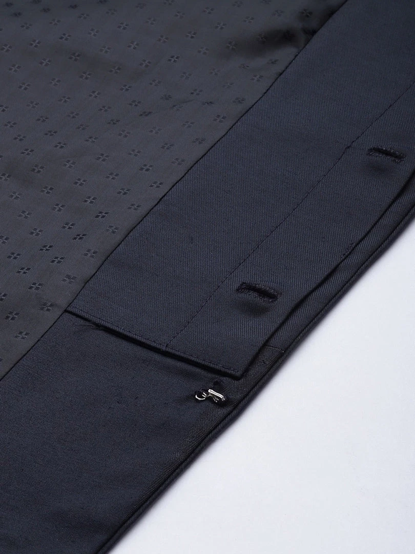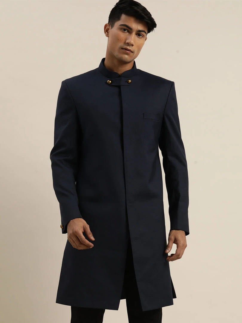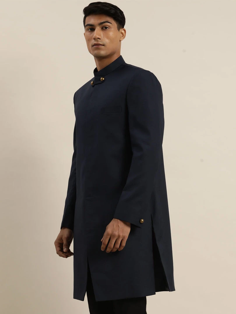 Navy Blue Solid Bandhgala Sherwani, has mandarin collar, long sleeves and button closure