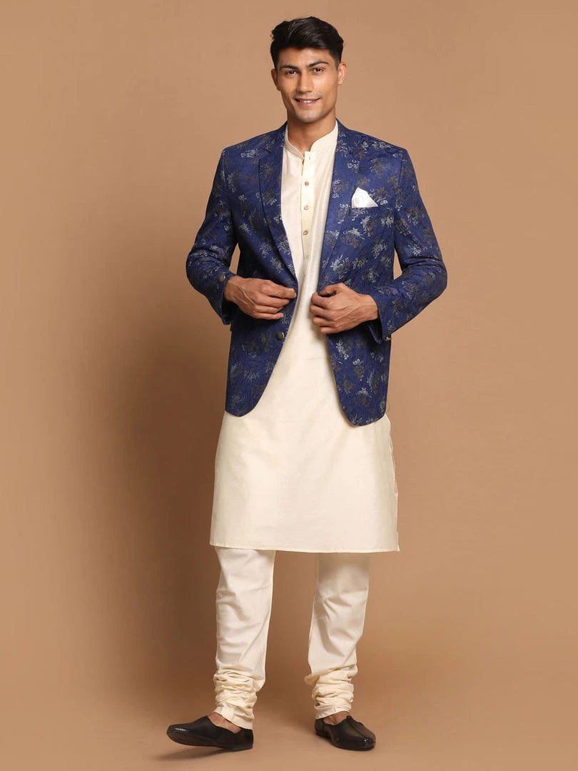 Navy Blue Woven Blazer And Cream Solid Kurta With Pajama Set