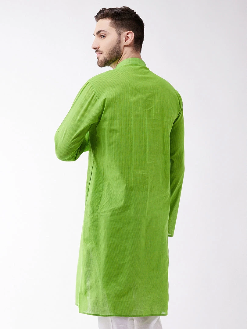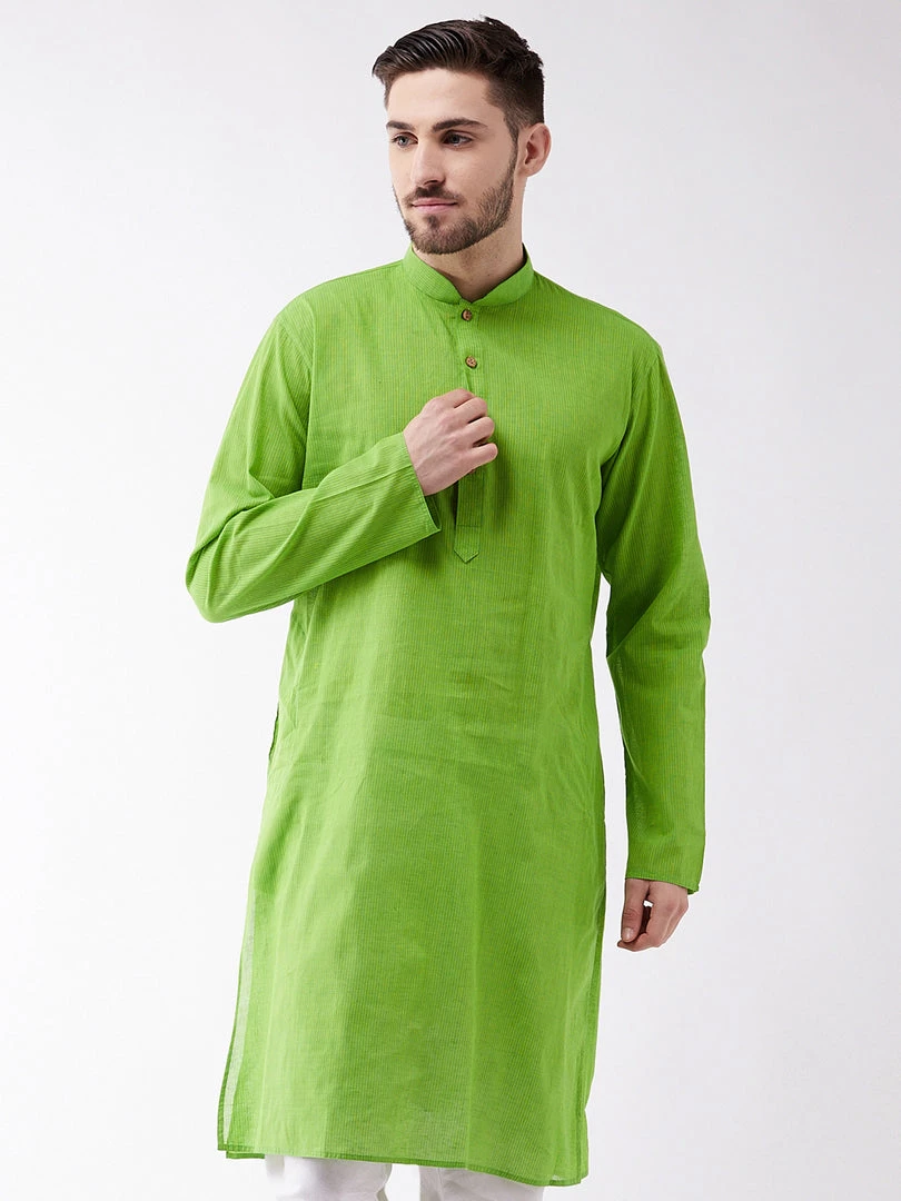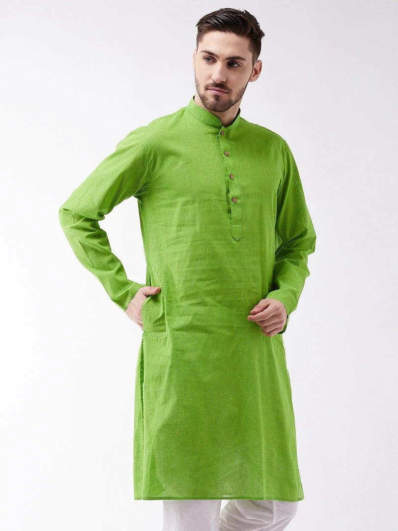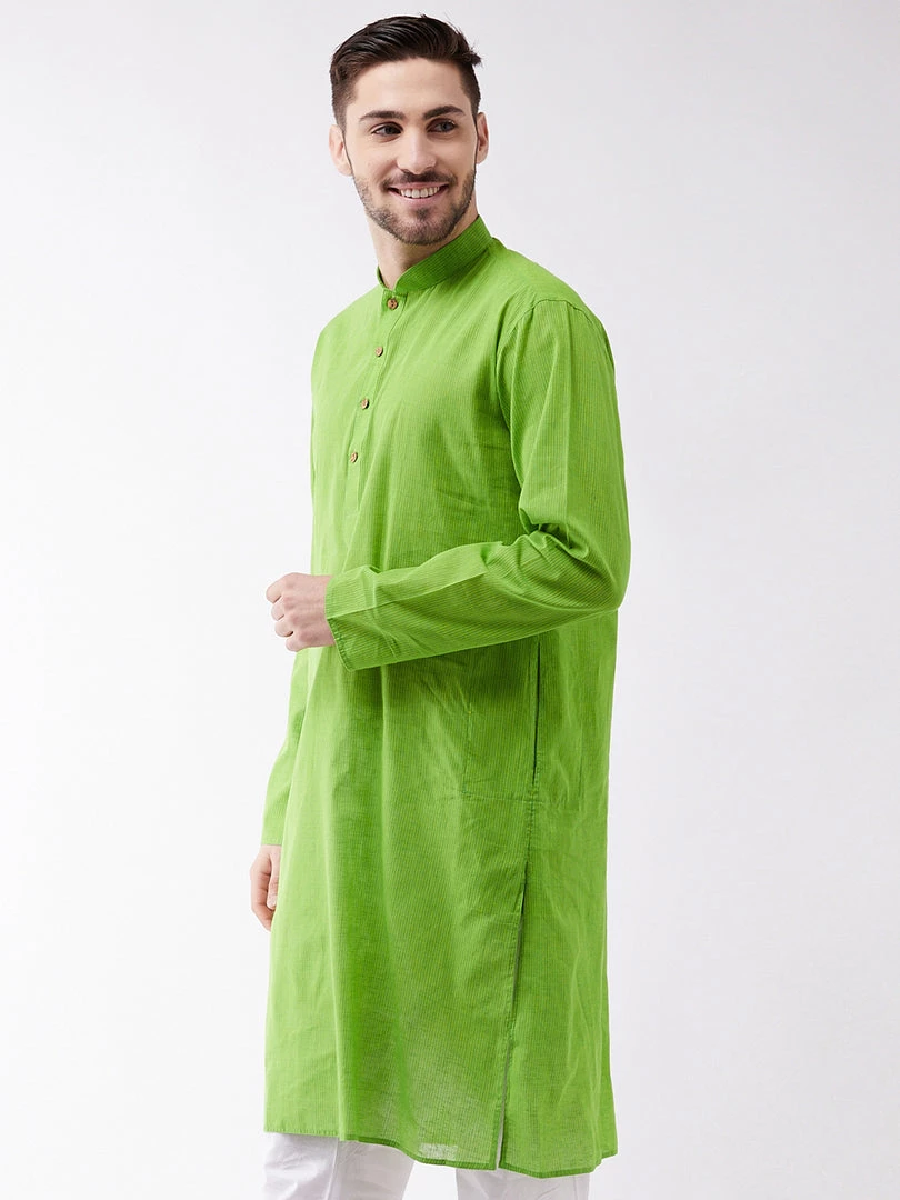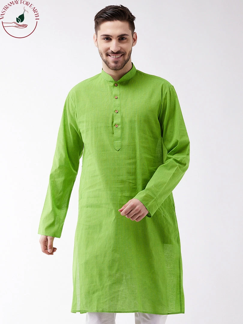 Green striped kurta has mandarin collar and Long, regular sleeves. Has straight shape with regular style. Above knee length with a straight hem. Pure Handloom cotton.