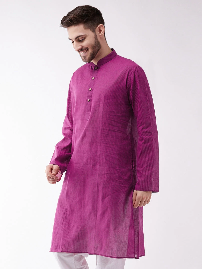 Purple striped kurta has mandarin collar and Long, regular sleeves. Has straight shape with regular style. knee length with a straight hem. Pure Handloom cotton.