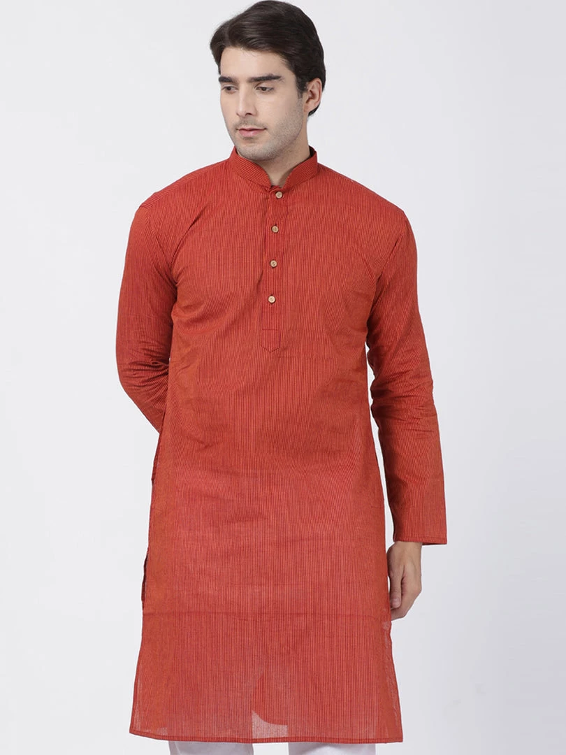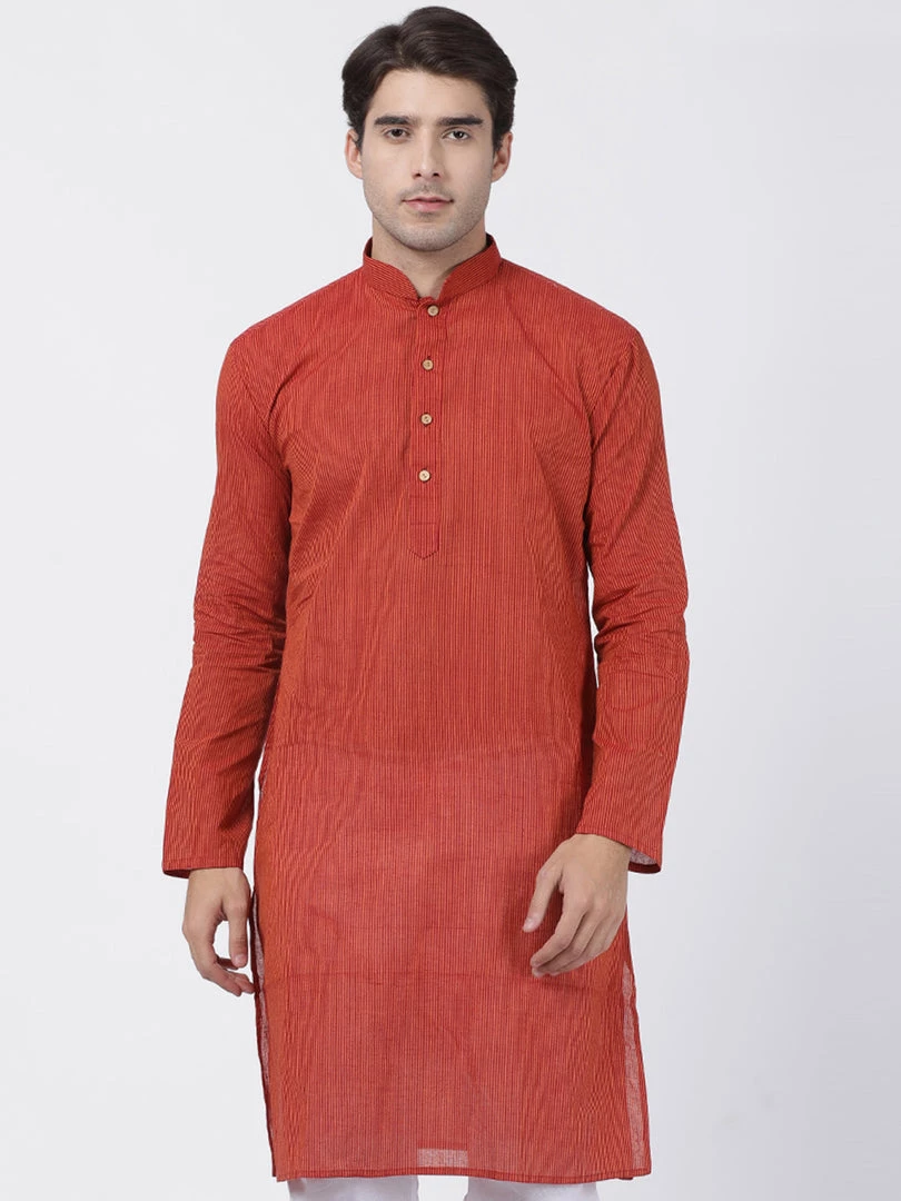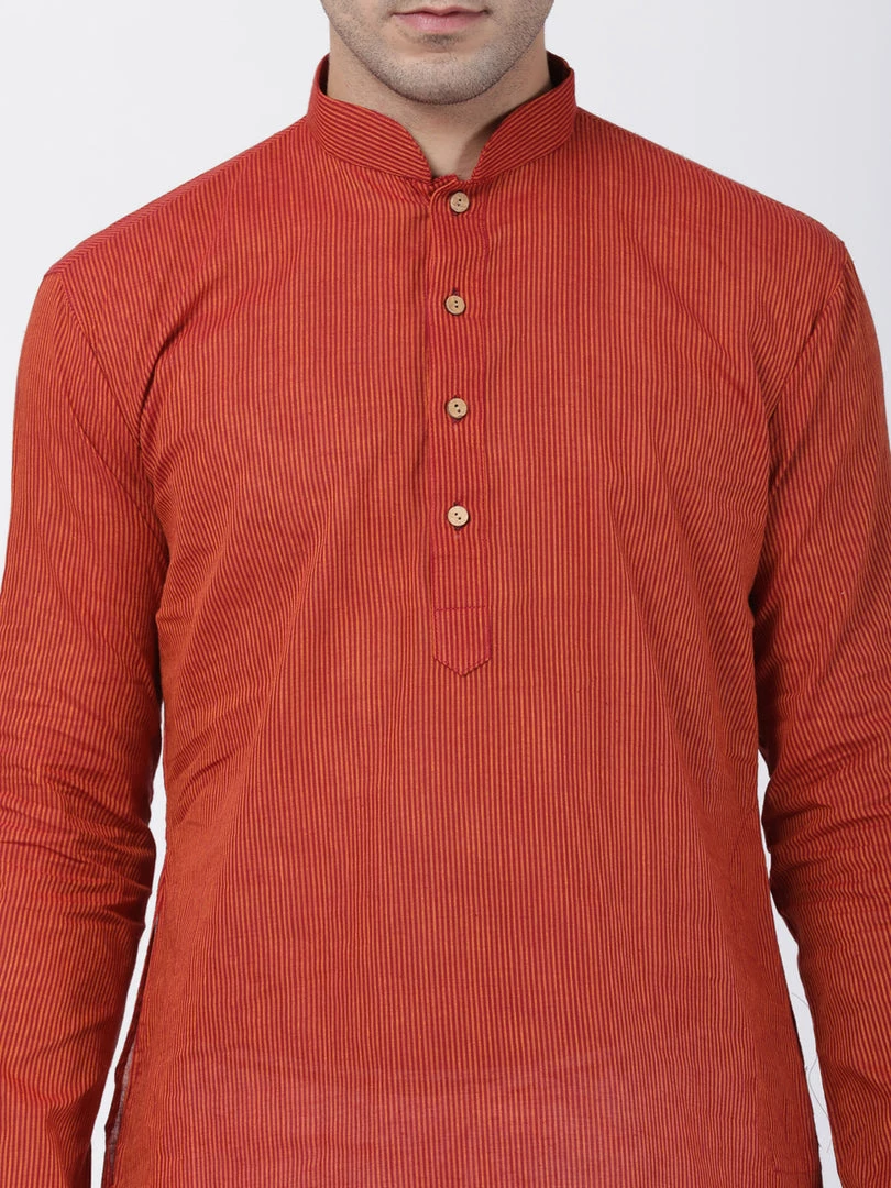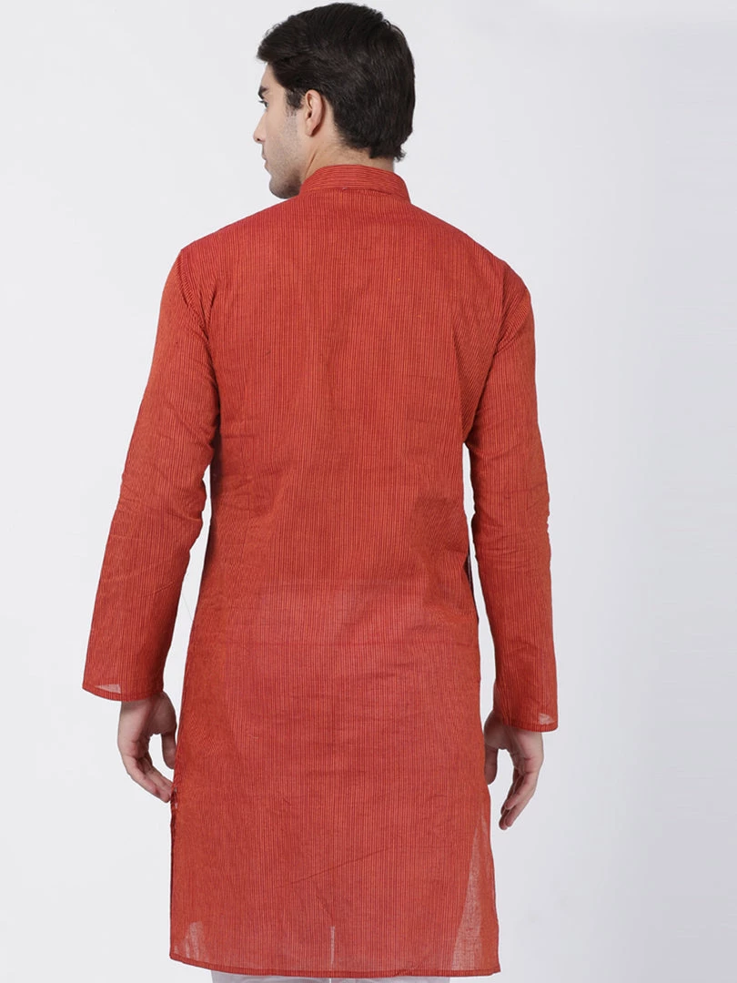 Rust striped kurta has mandarin collar and long, regular sleeves. Has straight shape with regular style. knee length with a straight hem. Pure Handloom cotton.