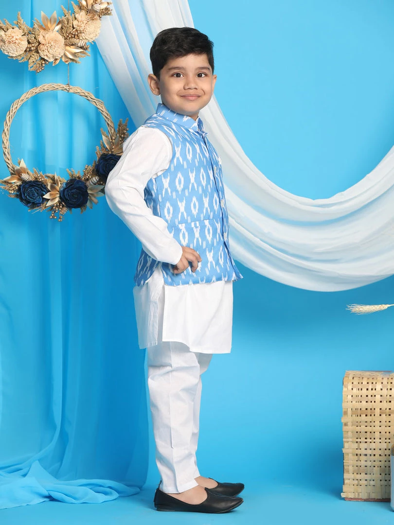 Aqua blue ikkat print Nehru jacket has mandarin collar with two pockets.