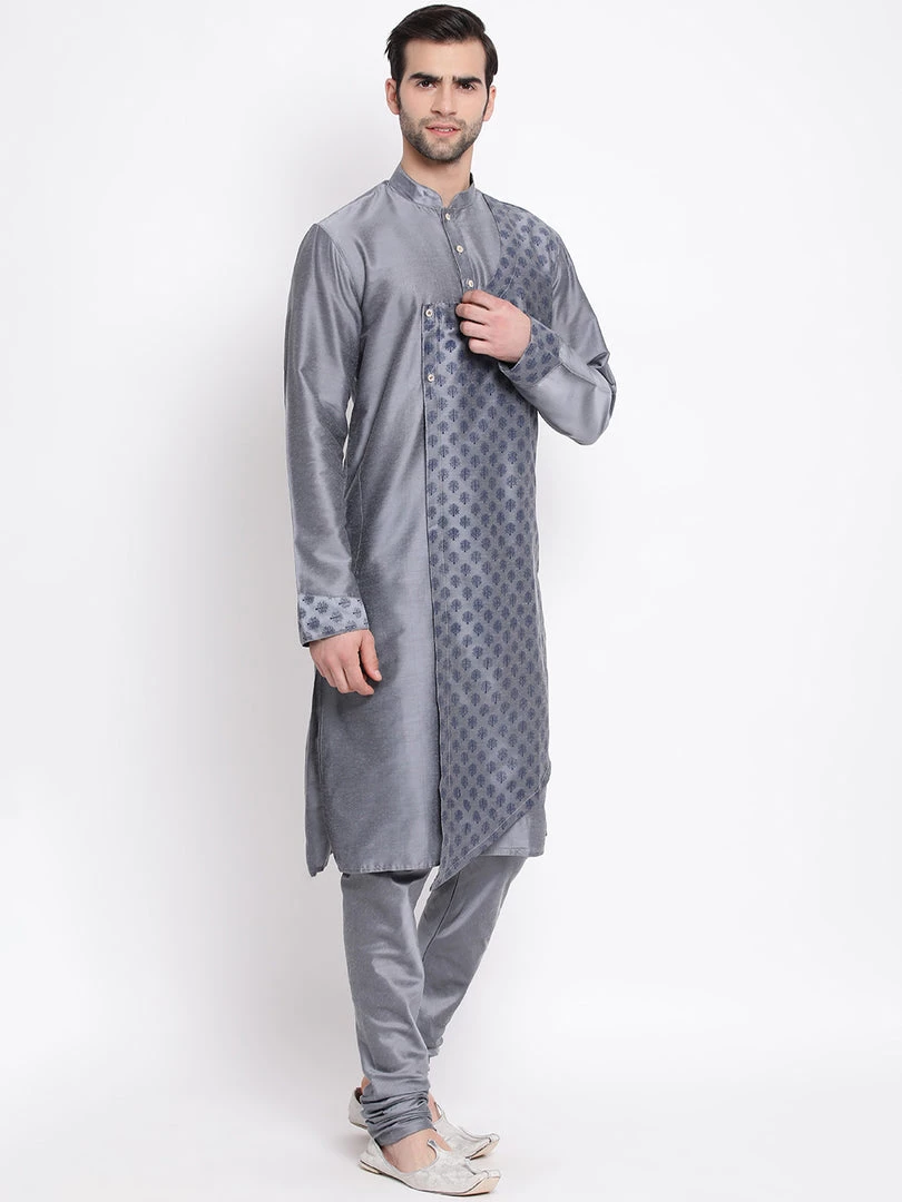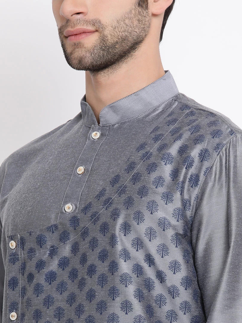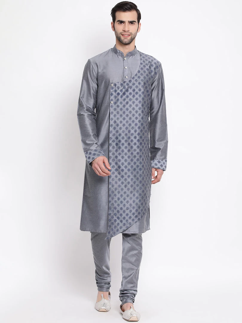 Grey straight angrakha style printed knee-length kurta, has a mandarin collar, long sleeves, asymmetric hem, button placket, side slits