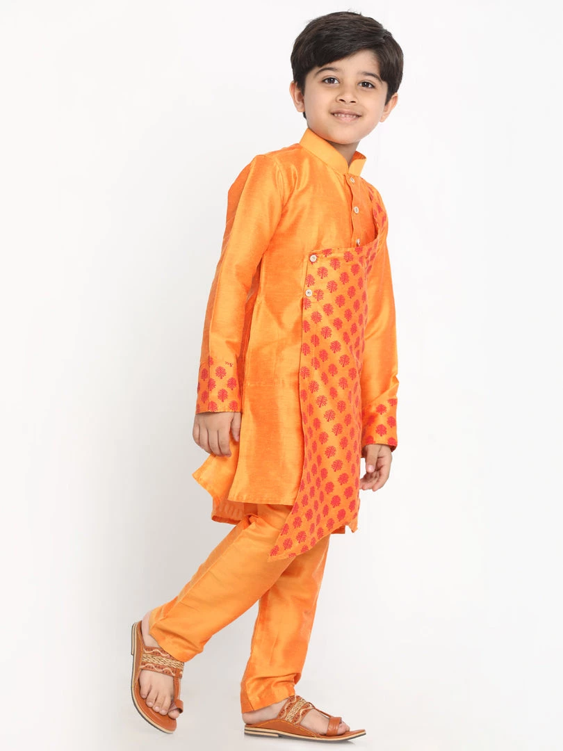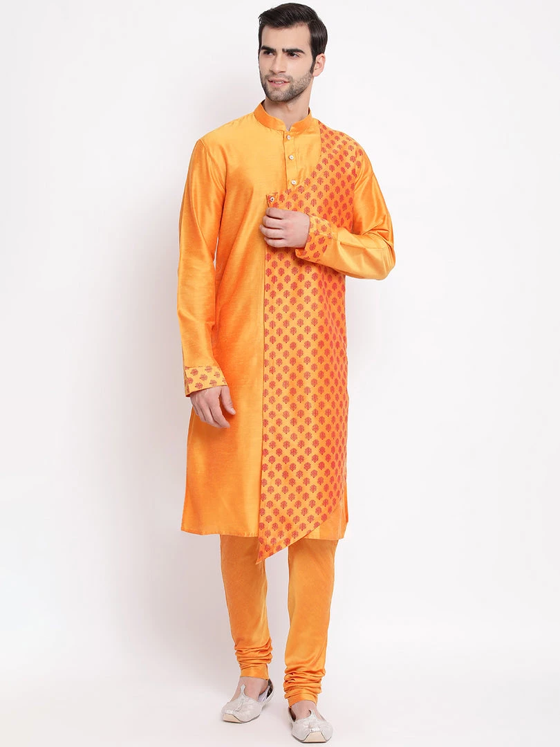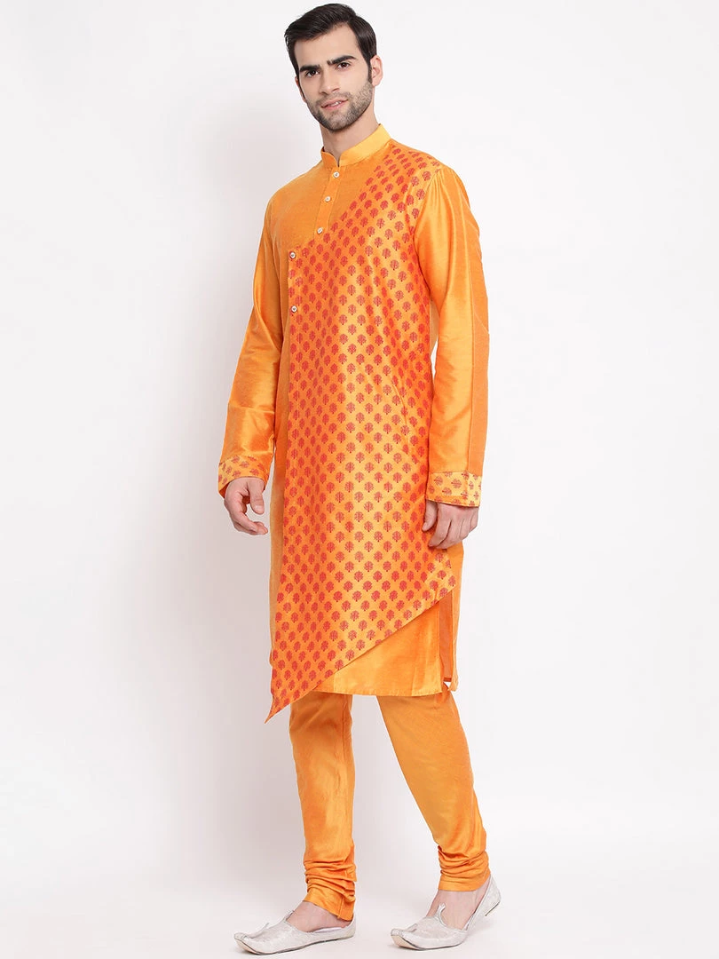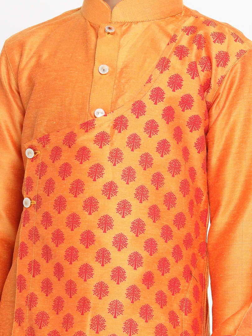 Orange straight angrakha style printed knee-length kurta, has a mandarin collar, long sleeves, asymmetric hem, button placket, side slits