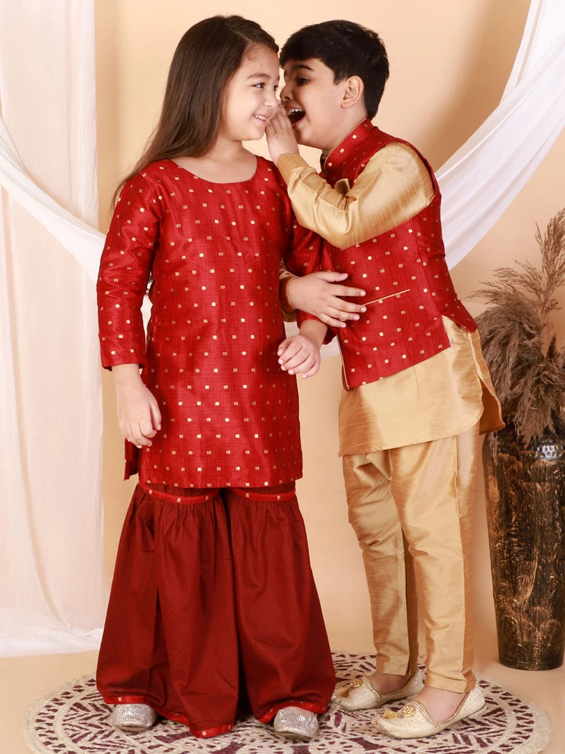 Golden and maroon solid kurta with pyjama and Nehru jacket.