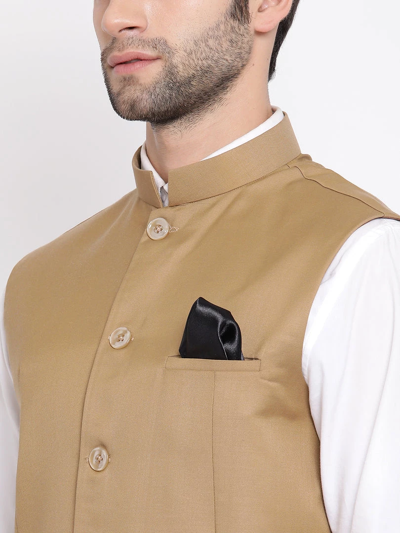 Beige solid Nehru jacket, has a mandarin collar, a full button placket, sleeveless, three welt pockets