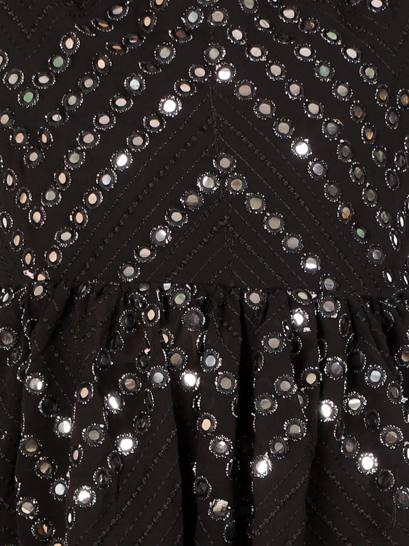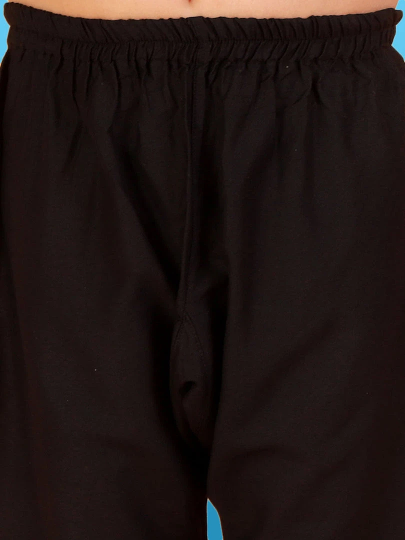 Boys black color mirror work kurta has mandarin collar, full sleeves, side slit and straight hem. and solid black pyjama.