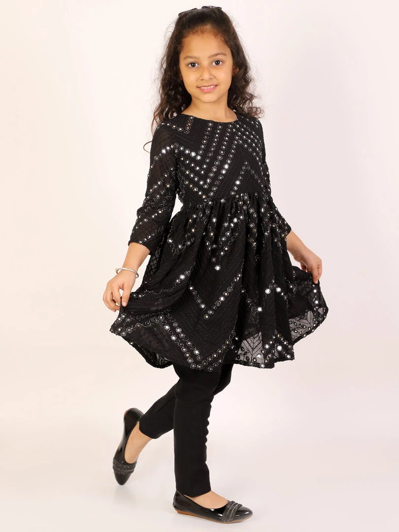Black frock style knee length kurta, three quater sleeves, has round neck, curved hem. Comes with Black solid chiridar, has elasticated waistband.