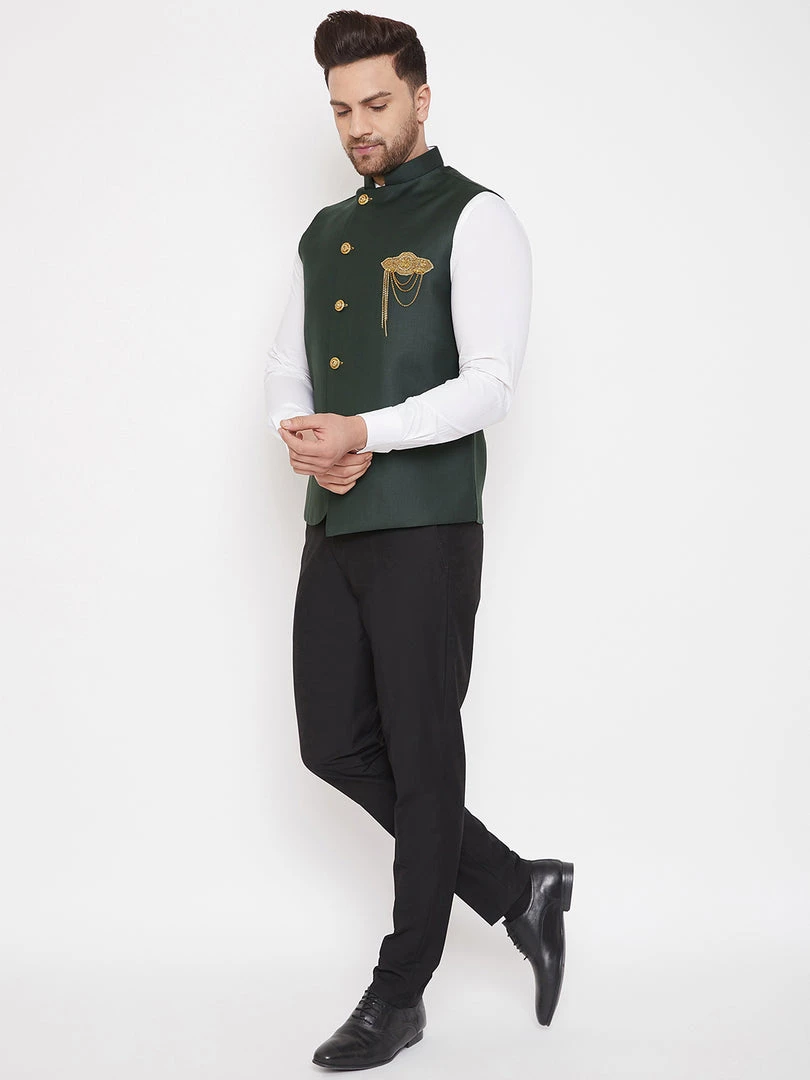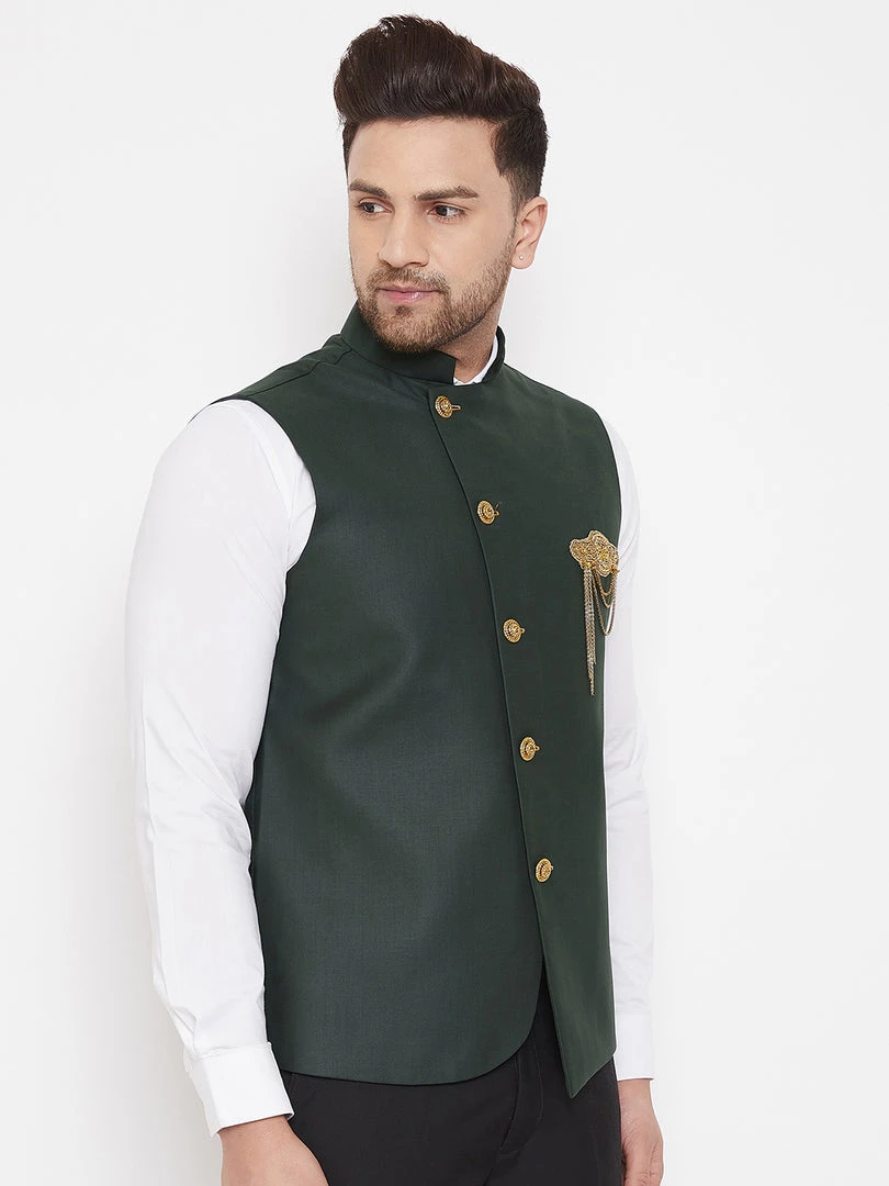 Bottle green classic royal Nehru jacket, has embroidered pocket detail, mandarin collar, regular length, Sleeveless, embroidered metallic button closure