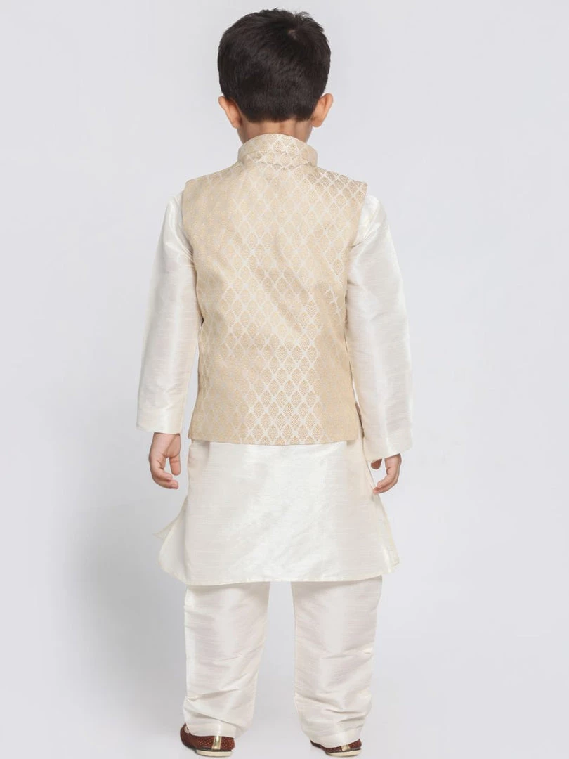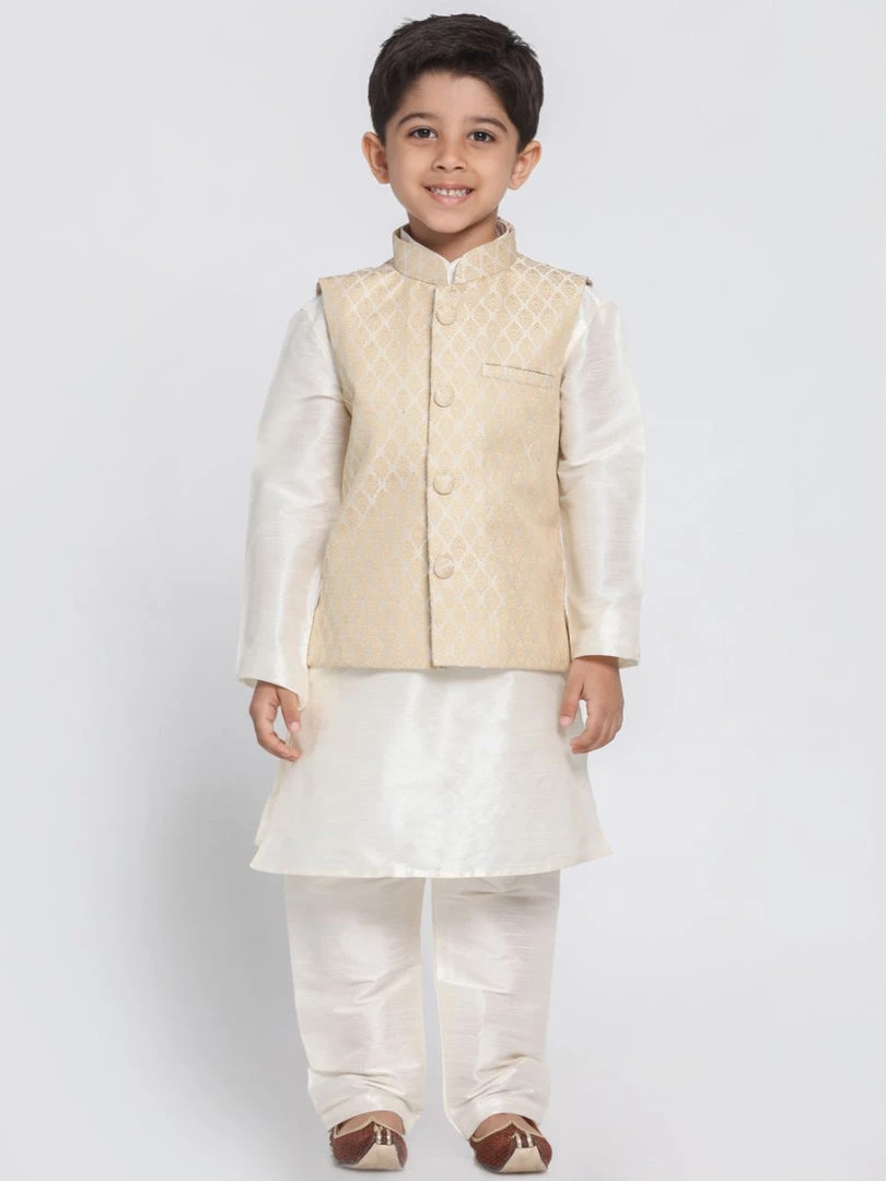 Beige solid straight knee length kurta, has a mandarin collar, long sleeves, straight hem, side slits with beige self-design woven Nehru jacket, has half sleeves, a mandarin collar and a welt pocket