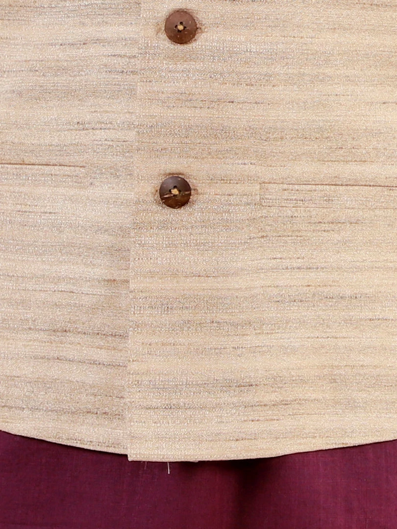 Beige woven Nehru jacket, has a mandarin collar, a full wooden button placket, sleeveless, three pockets