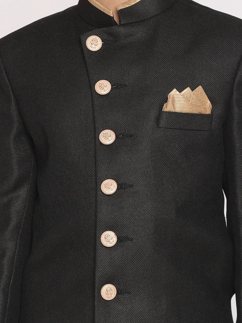 Black angrakha style above knee length sherwani, has a mandarin collar, full button placket, long sleeves, a straight hem, side slits, a welt pocket and pocket square. Comes with rose gold solid dhoti pant, has elasticated waistband.