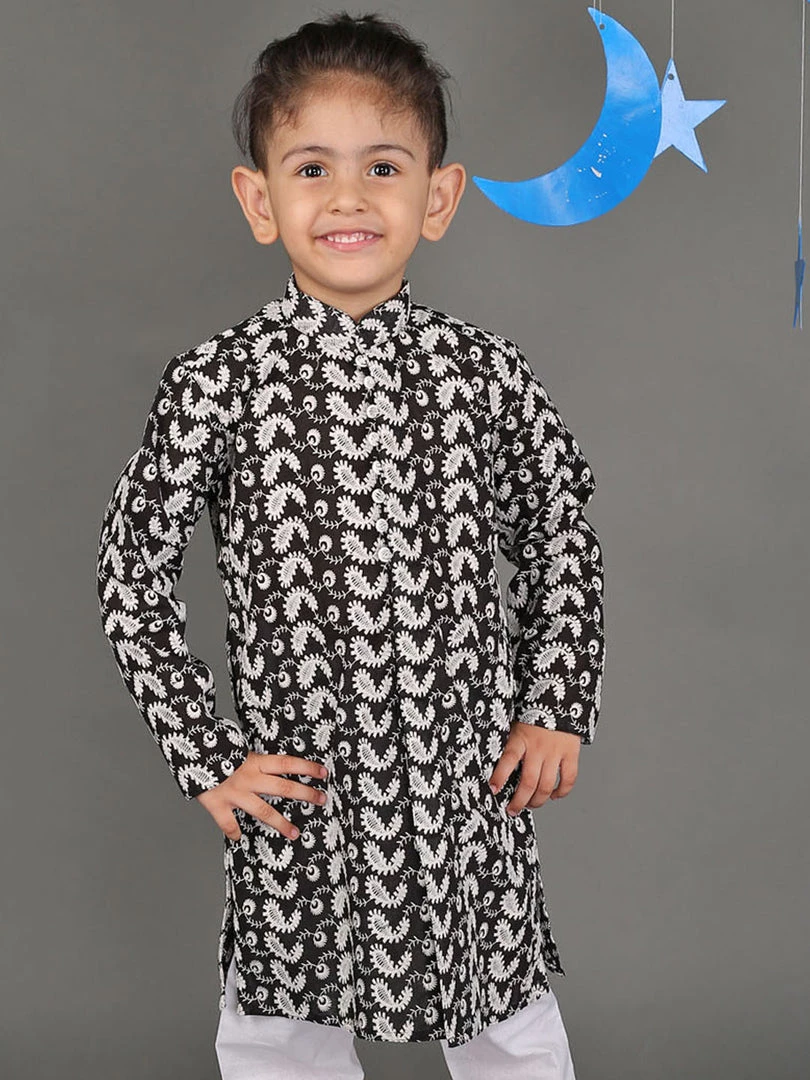 Black straight above knee length embroidered kurta, has a mandarin collar, long sleeves, full front button placket, straight hem, side slits