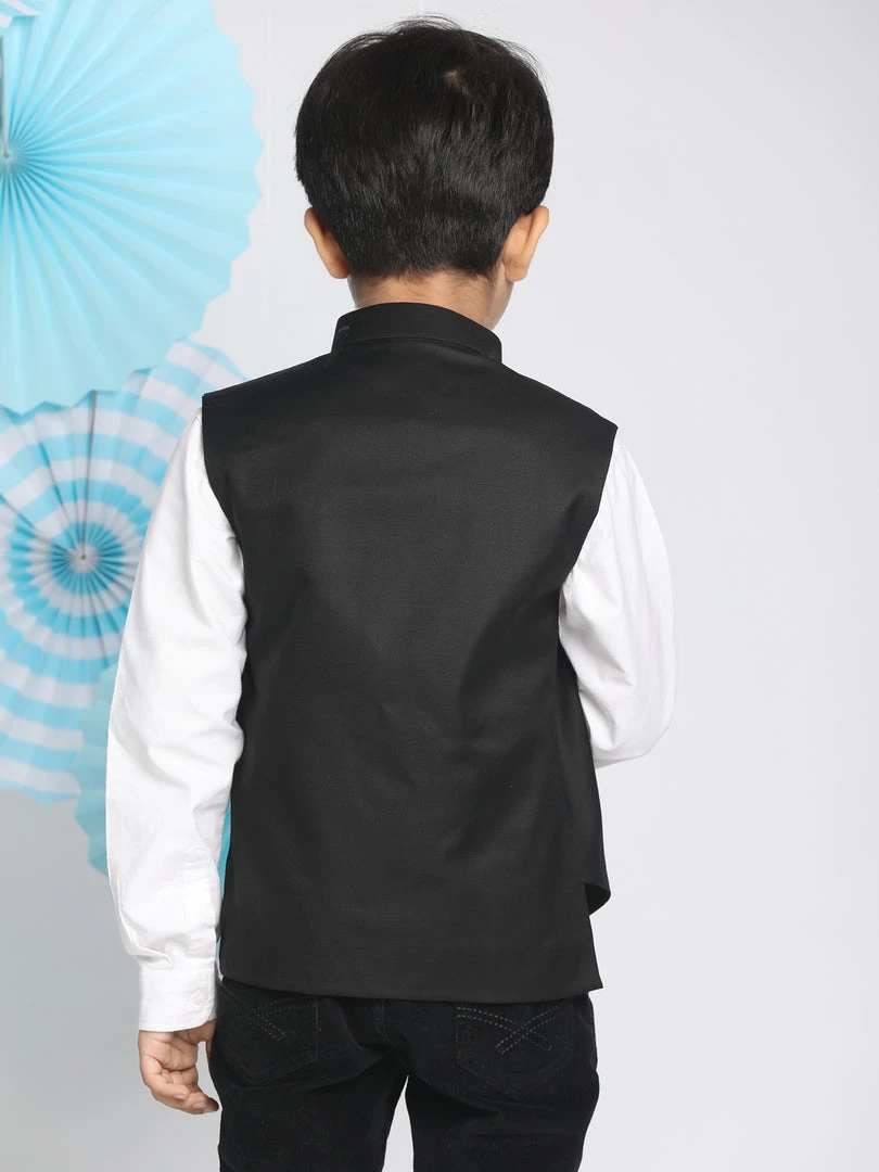 Black solid slim-fit satin nehru jacket, has a mandarin collar, a full button placket, sleeveless, one pocket and asymmetric hem Comes with a pocket square.