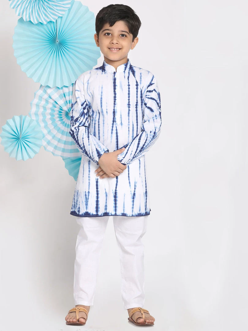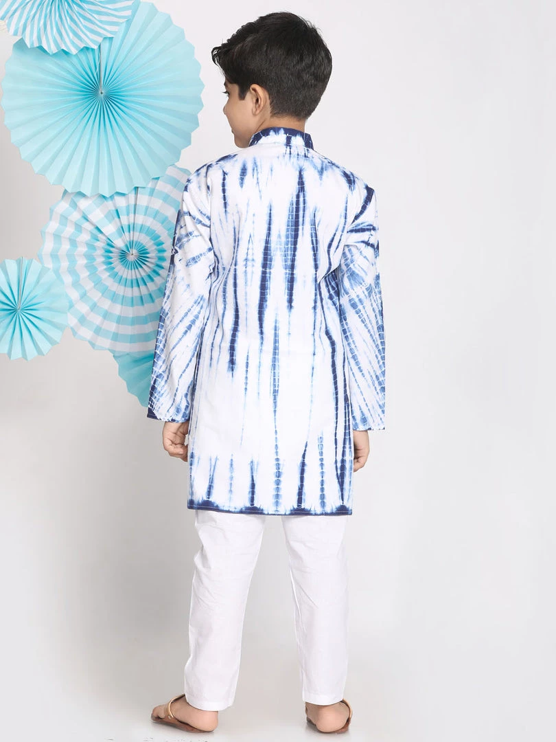 Blue and white tie dye straight cotton knee length kurta, has a mandarin collar, button placket, long sleeves, straight hem and side slits. Comes with white solid pyjama, has elasticated waistband.