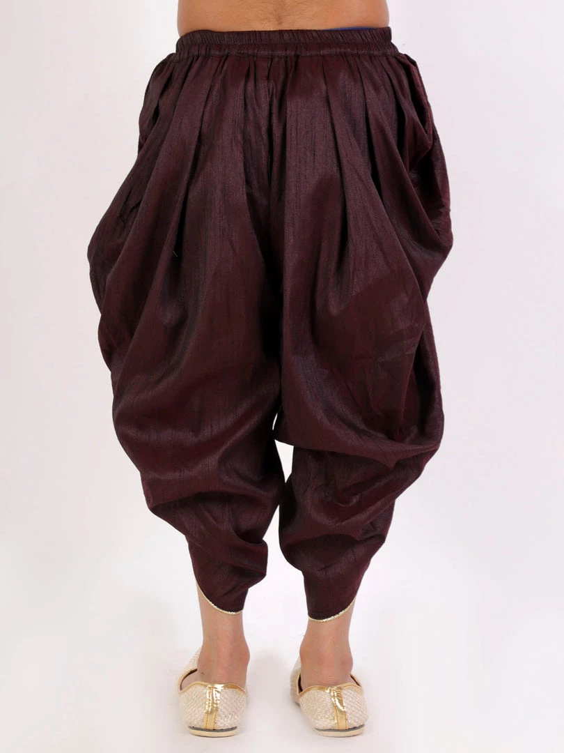 Burgundy mid-rise solid pleated silk-blend dhoti with golden piping and overlapping layer detail has an elasticated waistband.