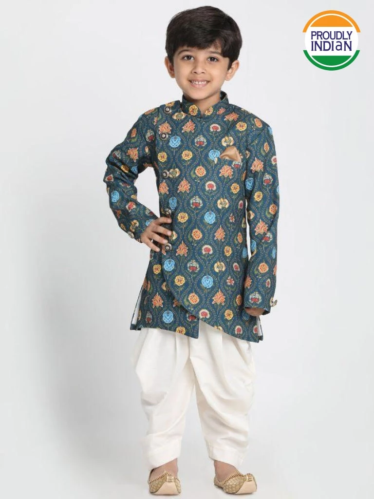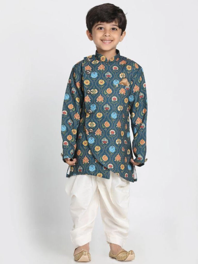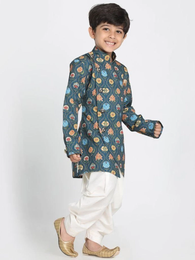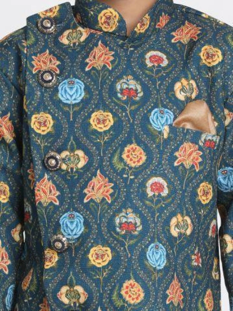 Deep blue printed sherwani, has a mandarin collar, a side button placket, long sleeves, one chest welt pocket, and side slits