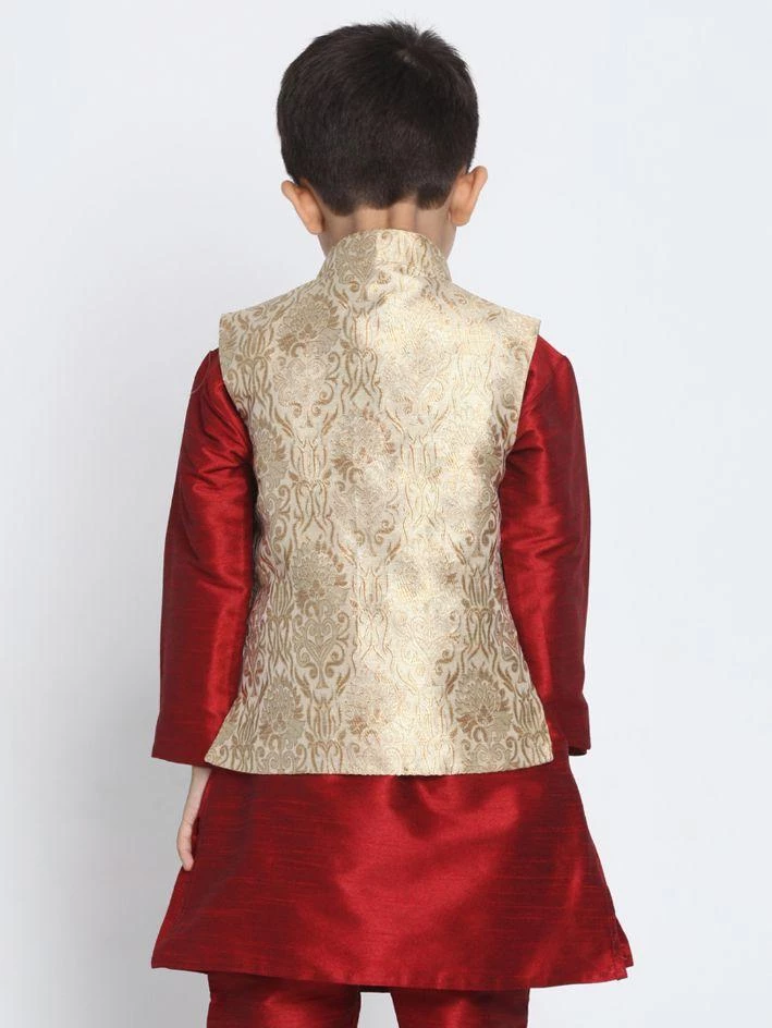 Gold toned self-design woven Nehru jacket, has a mandarin collar, a front button placket, sleeveless, one pocket and straight hem. Comes with pocket square