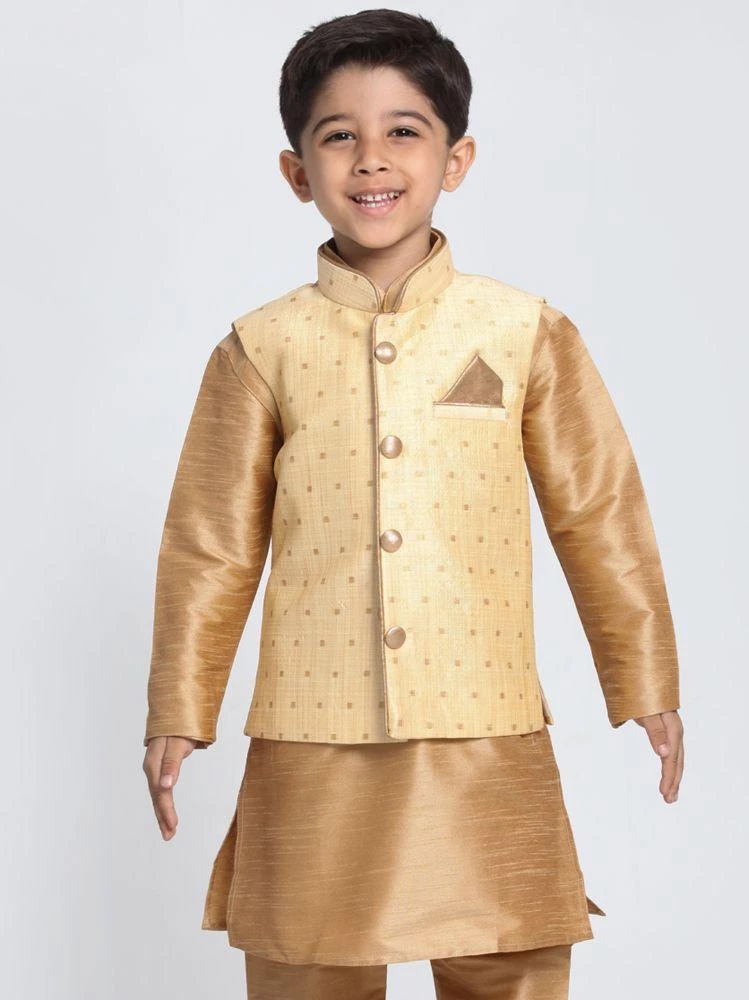 Golden self-design woven Nehru jacket, has a mandarin collar, a front button placket with a golden button, sleeveless, one pocket, and a straight hem. Comes with a pocket square
