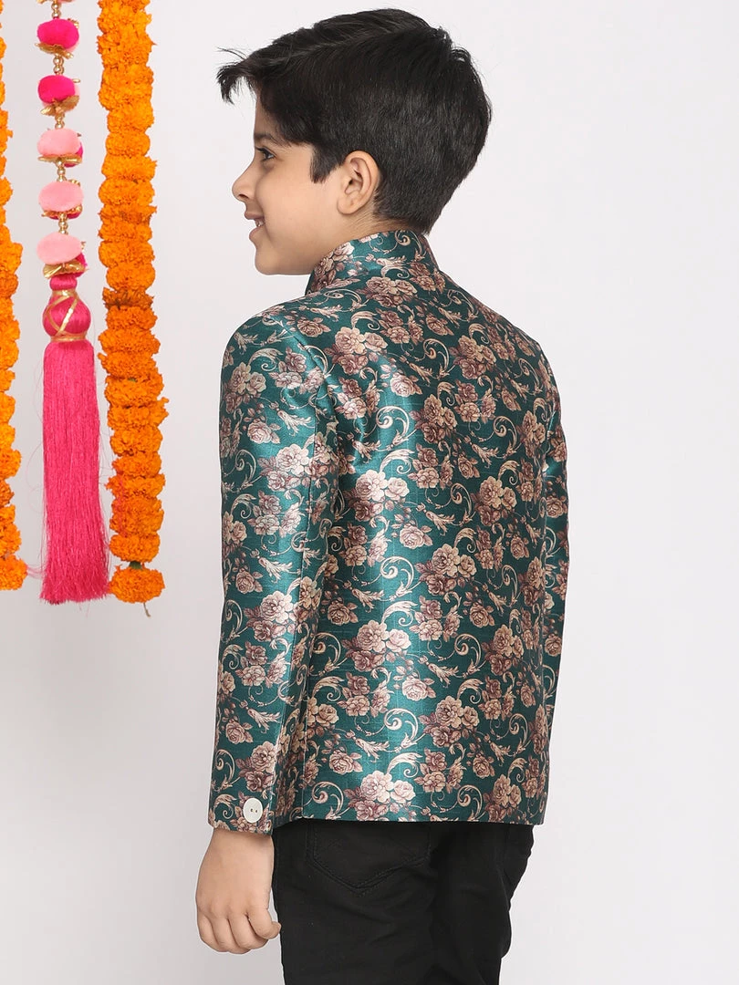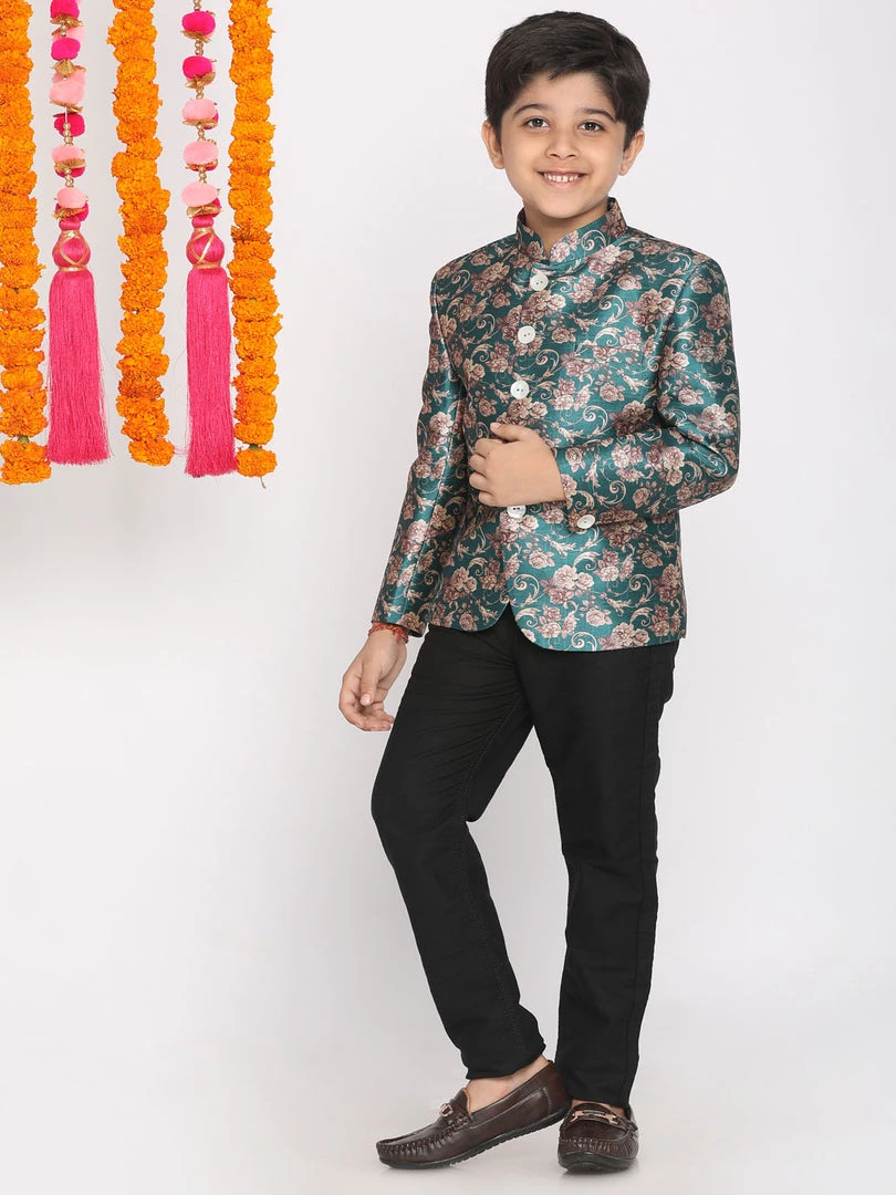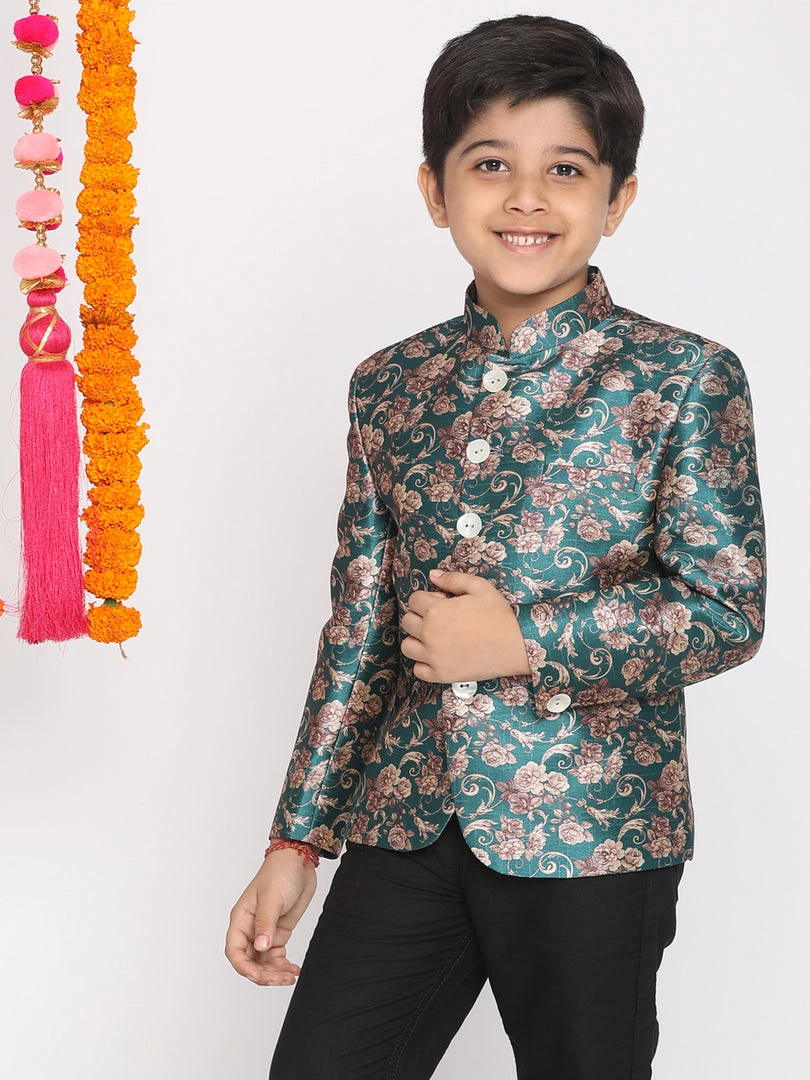 Multicolored-Base-Green regular-fit printed Jodhpuri, has a mandarin collar, a full button placket, long sleeves, Straight hemline.