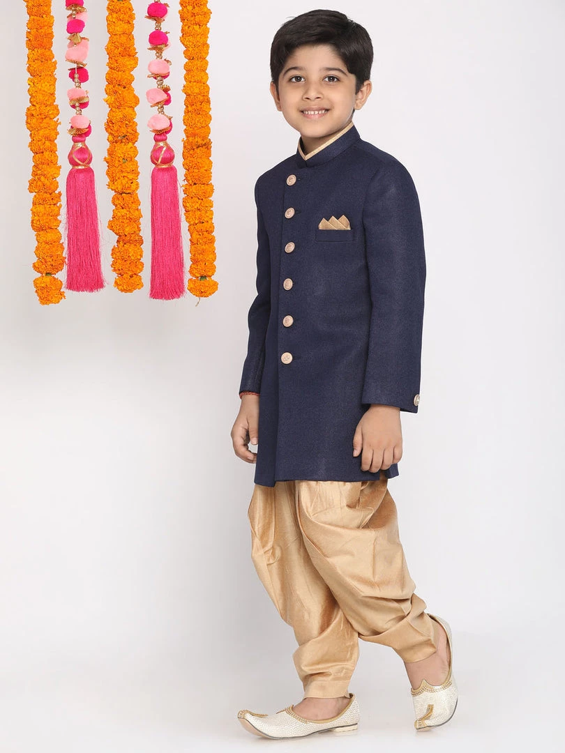 Navy blue angrakha style above knee length sherwani, has a mandarin collar, full button placket, long sleeves, a straight hem, side slits, a welt pocket and pocket square. Comes with rose gold solid dhoti pant, has elasticated waistband.