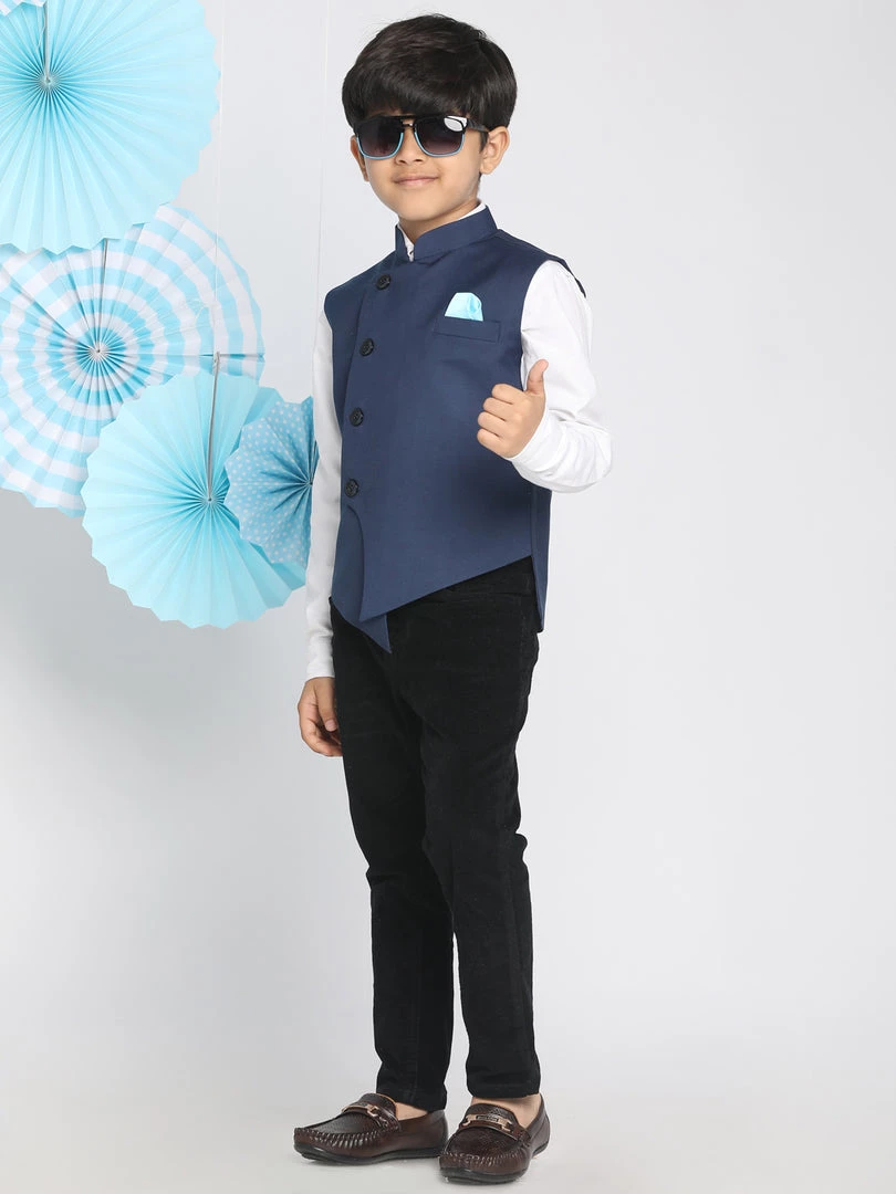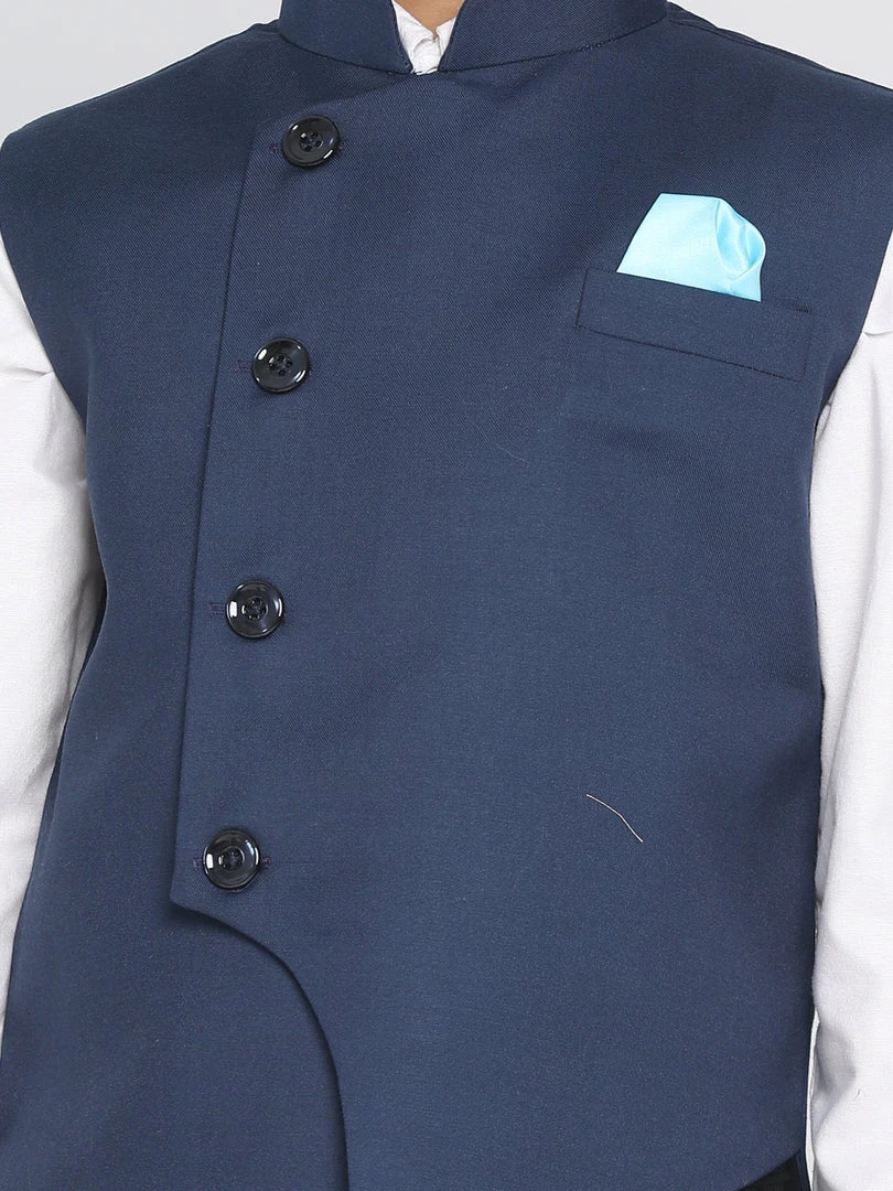 Navy blue solid slim-fit satin nehru jacket, has a mandarin collar, a full button placket, sleeveless, one pocket and asymmetric hem Comes with a pocket square.