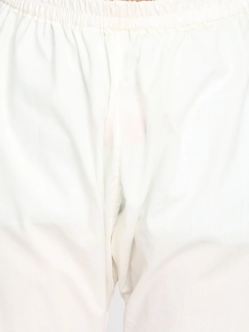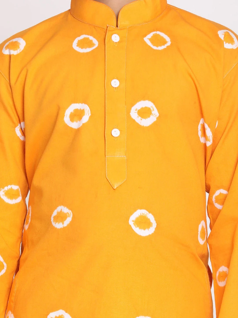 Orange and white tie-dye straight cotton knee length kurta, has a mandarin collar, button placket, long sleeves, a straight hem, and side slits. Comes with white solid pyjama, has elasticated waistband.