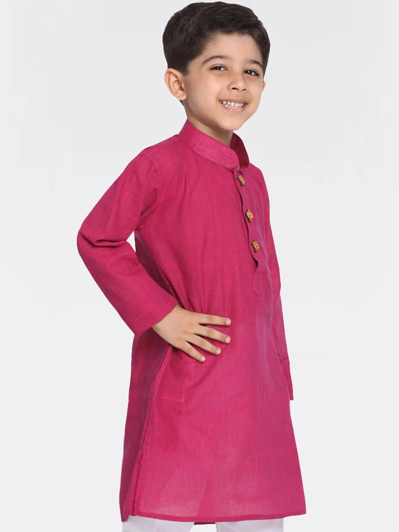 Purple woven stripe straight knee length kurta, has a mandarin collar, long sleeves, button placket with kite shape wooden button, straight hem, side slits