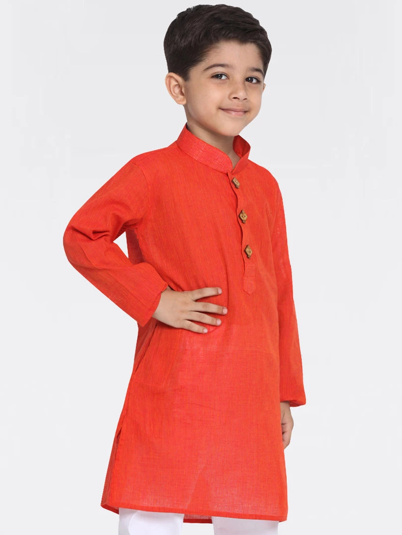 Red woven stripe straight knee length kurta, has a mandarin collar, long sleeves, button placket with kite shape wooden button, straight hem, side slits