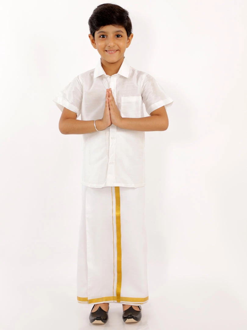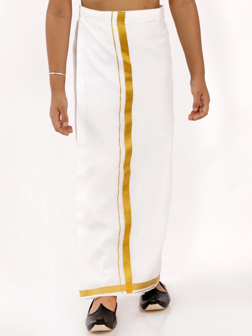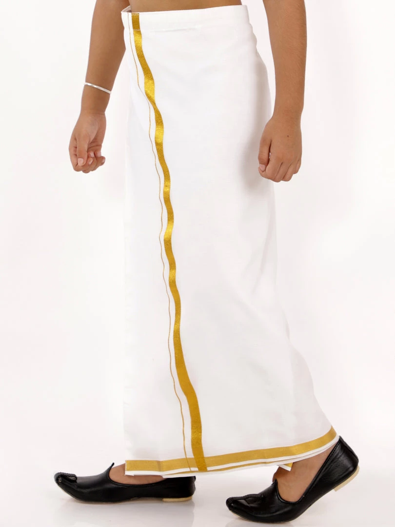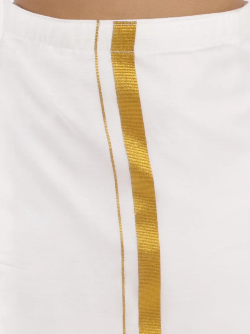 White solid dhoti with Velcro for hassle free wear, has a slip-on closure and golden border.