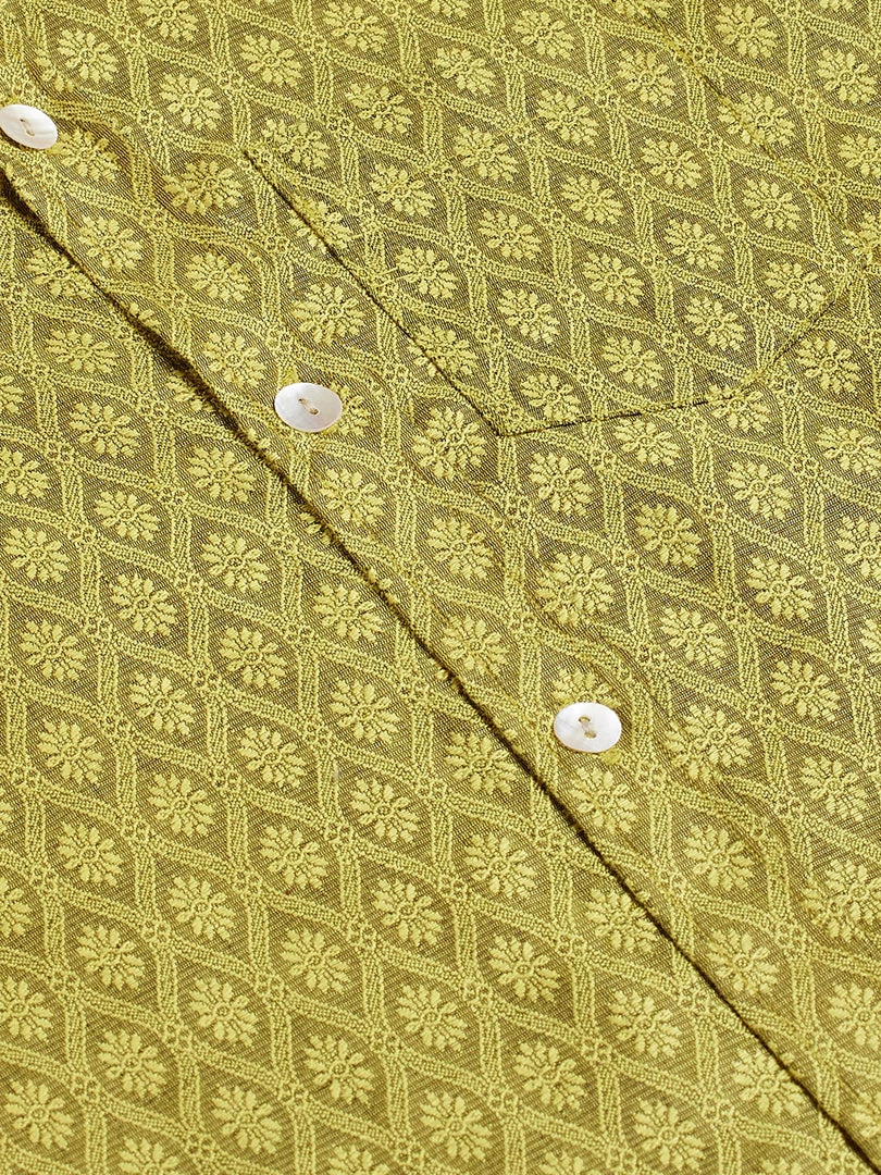 Yellow regular-fit jacquard shirt, has a mandarin collar, a full button placket, long sleeves, Straight hemline.