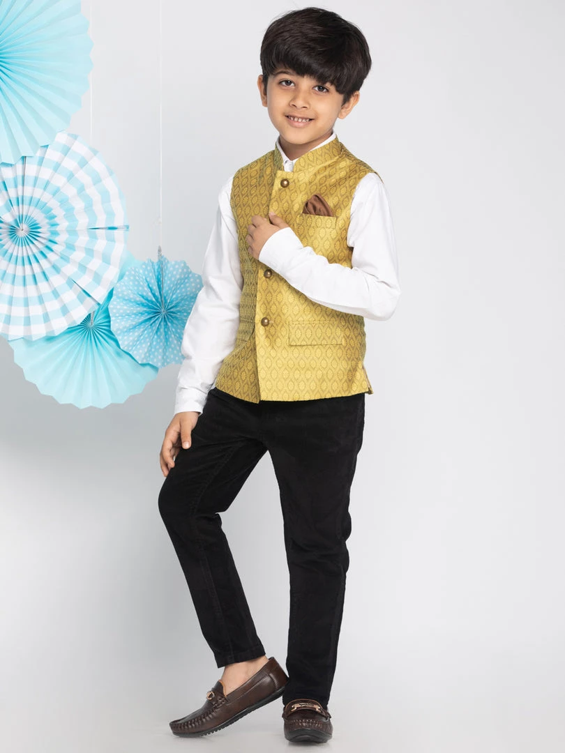Yellow woven Nehru jacket, has a mandarin neck, a full button placket, sleeveless, straight hem, and one pocket with a pocket square.