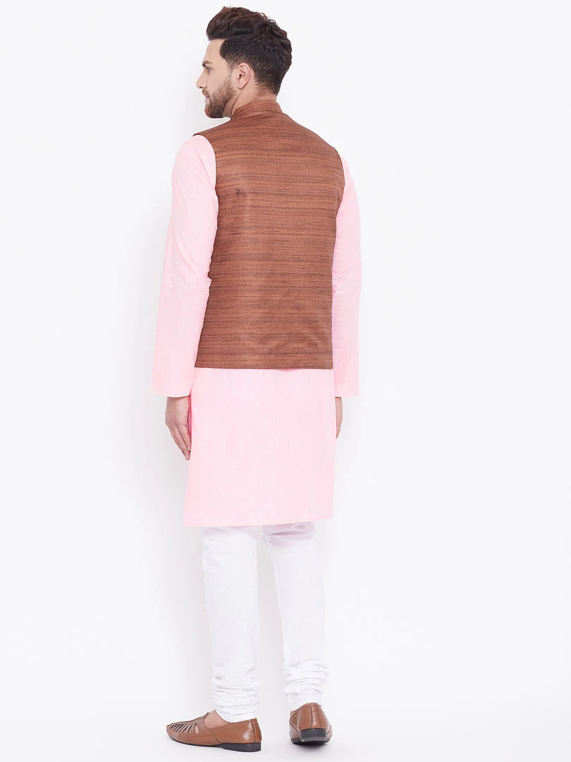 Brown woven Nehru jacket, Regular style, straight waist-length Nehru jacket, has a Mandarin collar, Sleeveless, Straight hem, and one pocket.