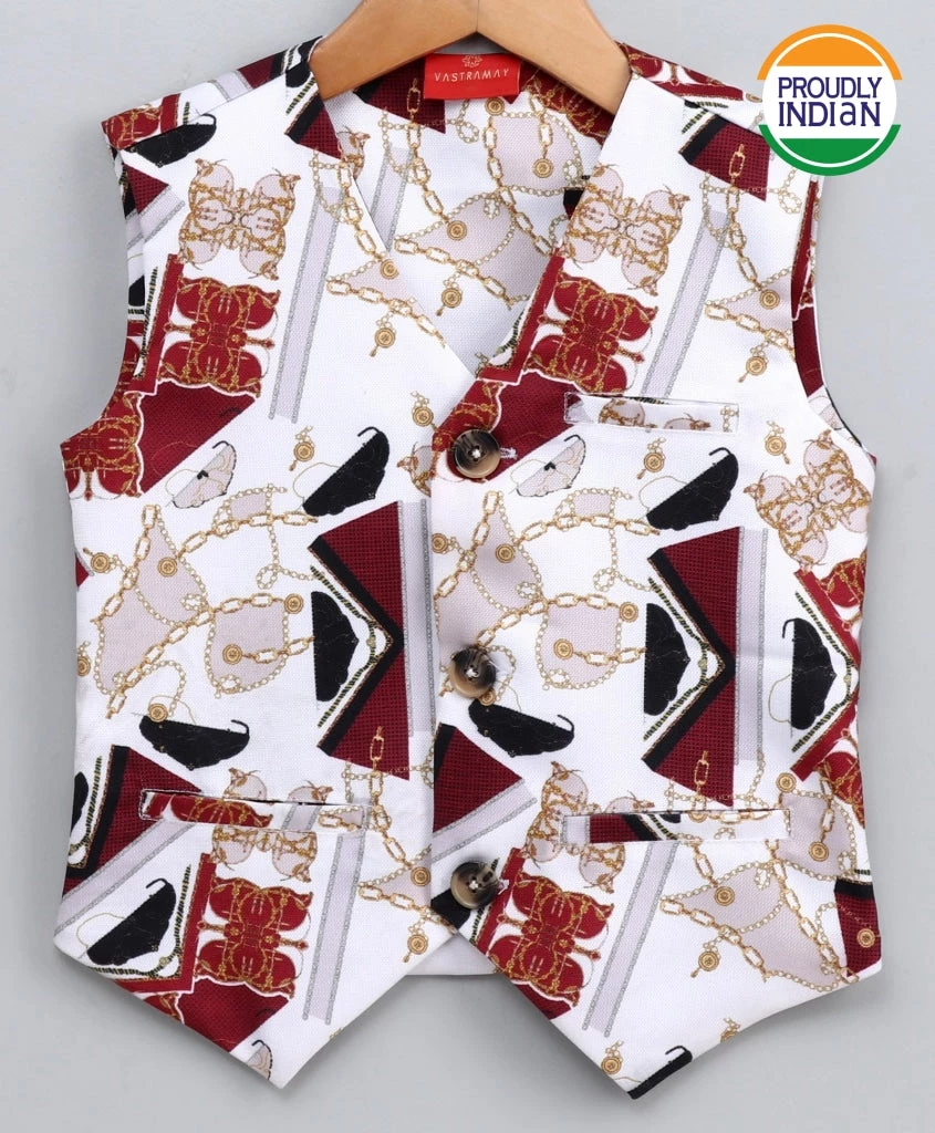 Maroon printed Jute blend Waist Coat Jacket, has V-Neck, button closure, sleeveless, and chest pocket