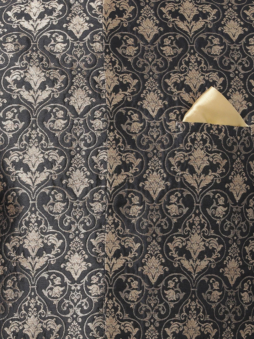 Black Woven Nehru jacket has a Round Neck, sleeveless, One Pocket with a pocket square, straight hem.