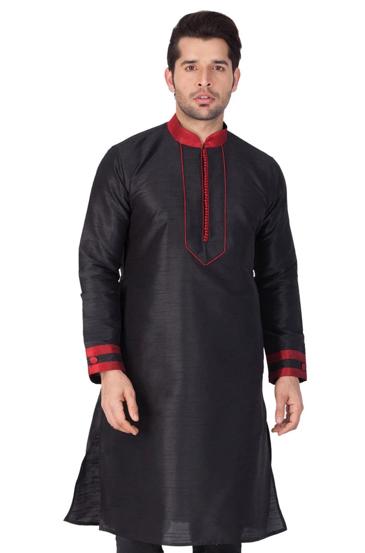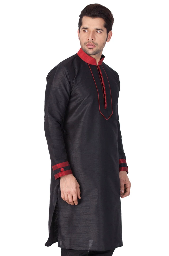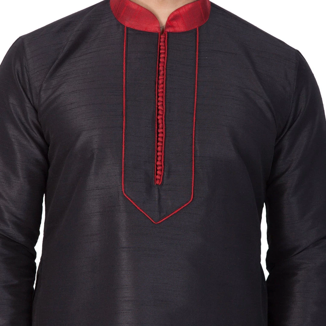 Black solid straight kurta with contrast red mandarin collar, long sleeves, straight hem, and side slits.