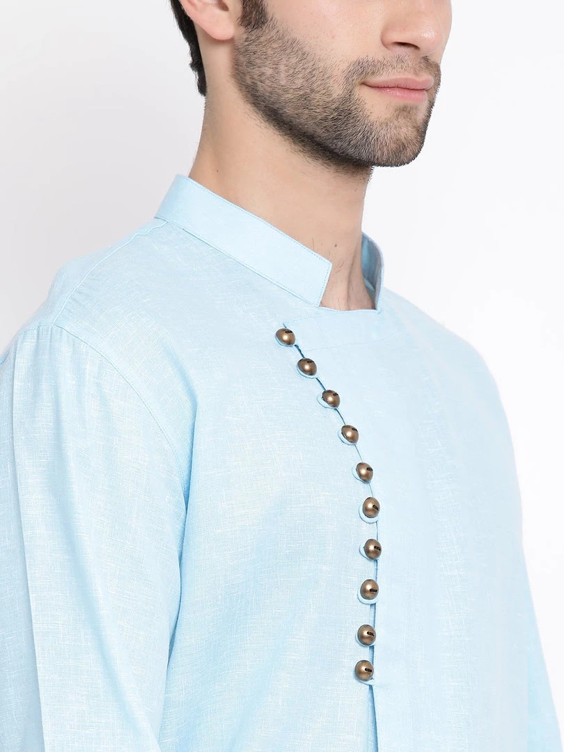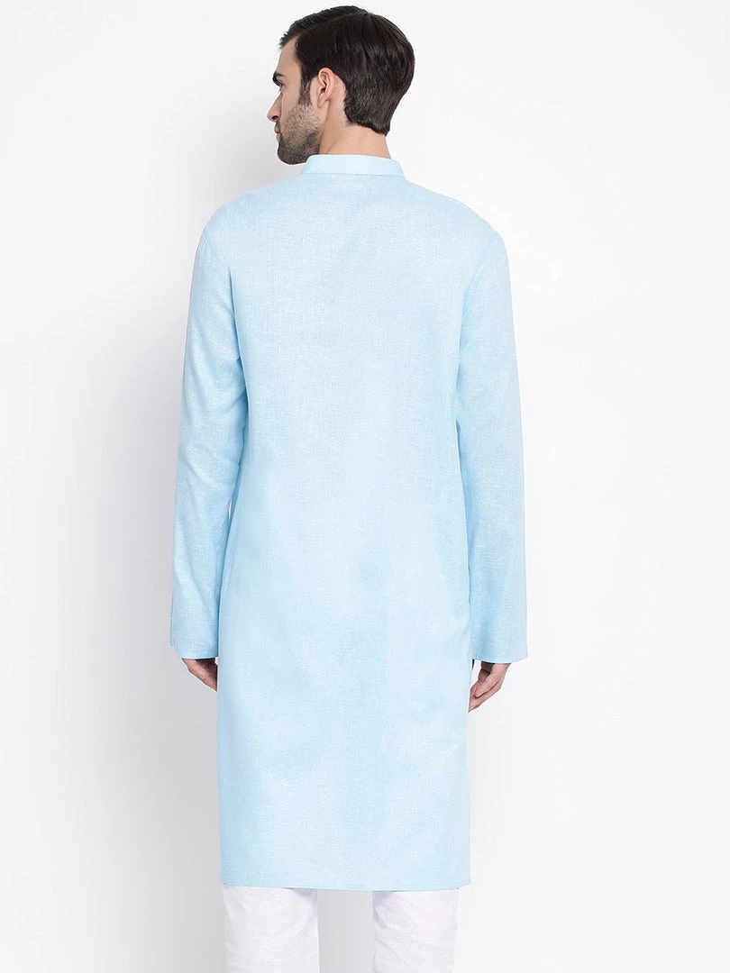 Light blue angrakha style straight kurta, has a mandarin collar, long sleeves, straight hem, and side slits.