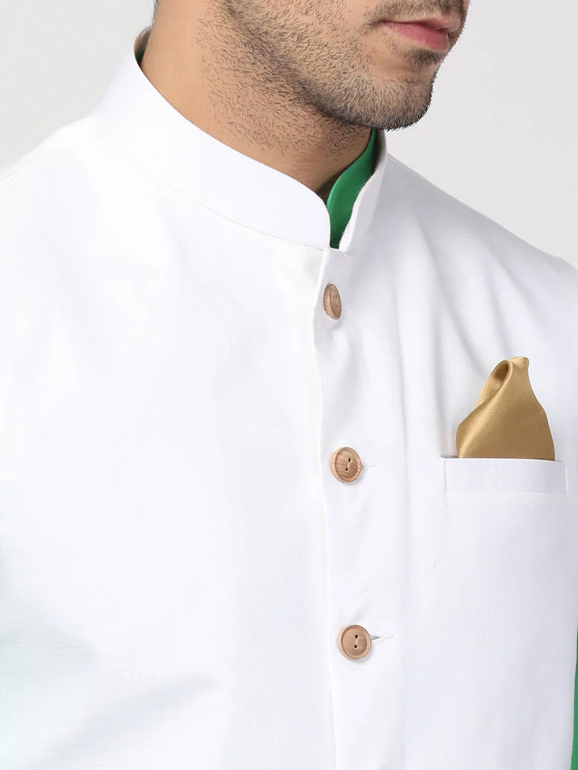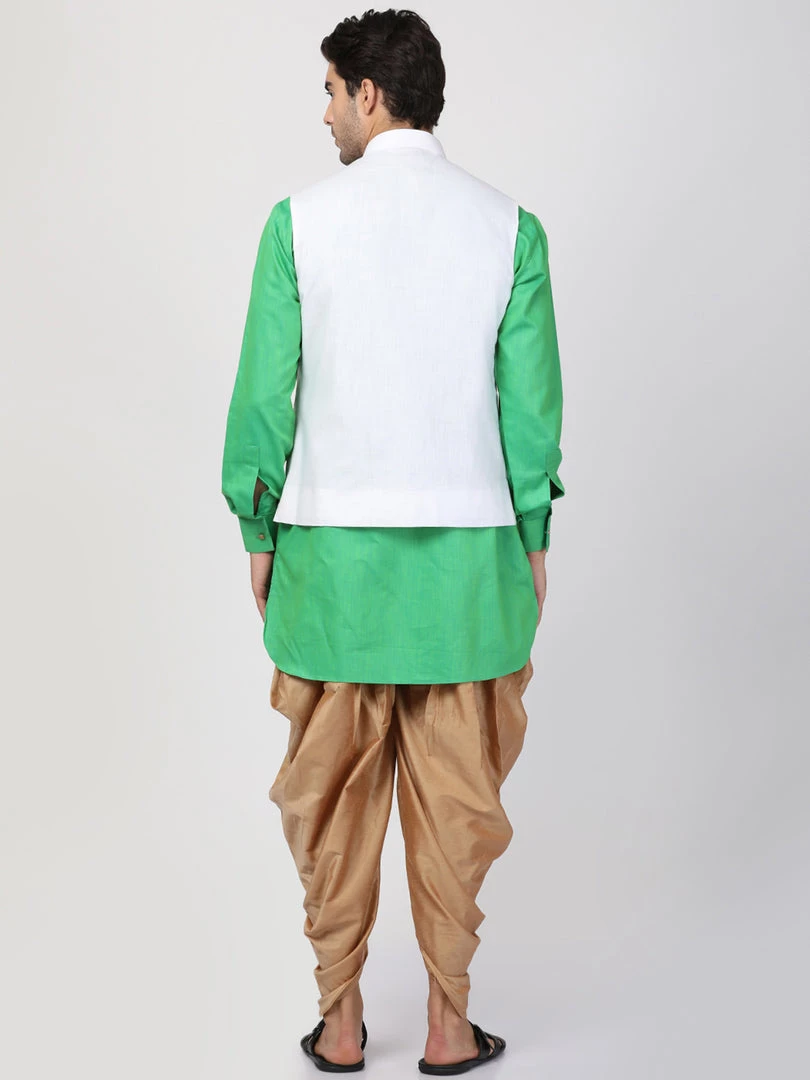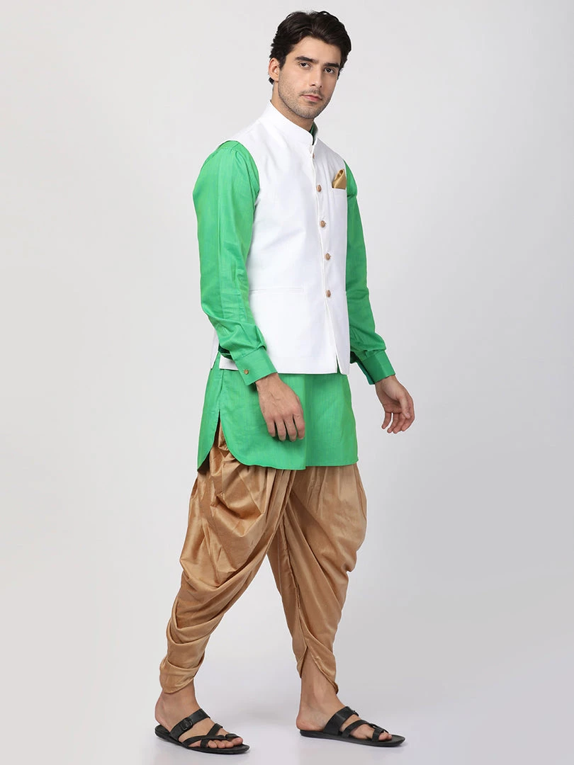 Green solid kurta with solid dhoti pant and white Nehru jacket