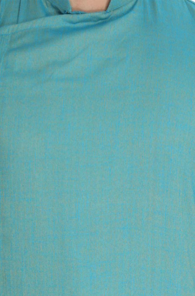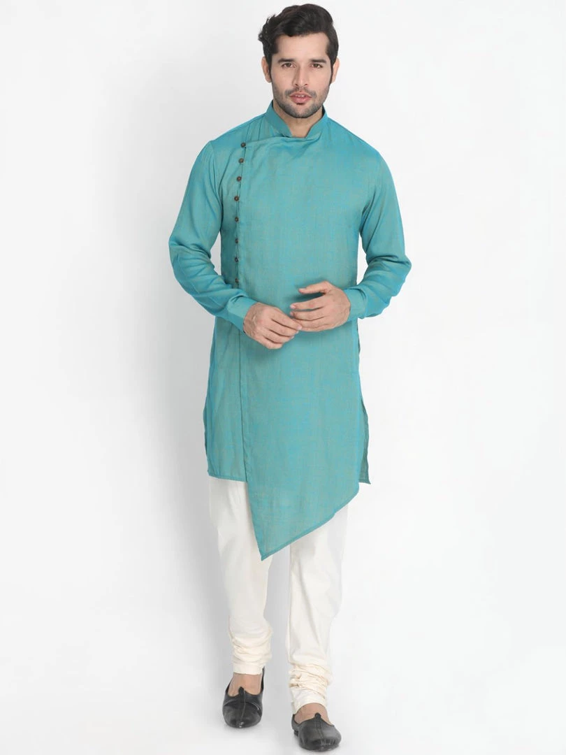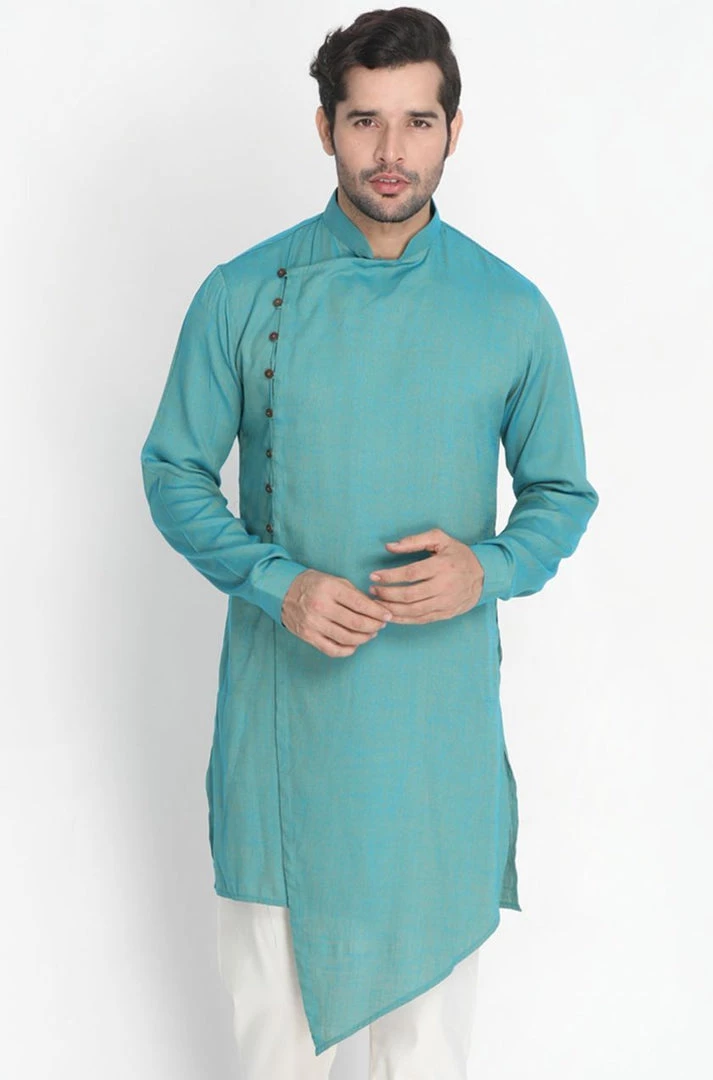 Green angrakha style solid straight knee length kurta, has a mandarin collar, long sleeves, asymmetric hem.