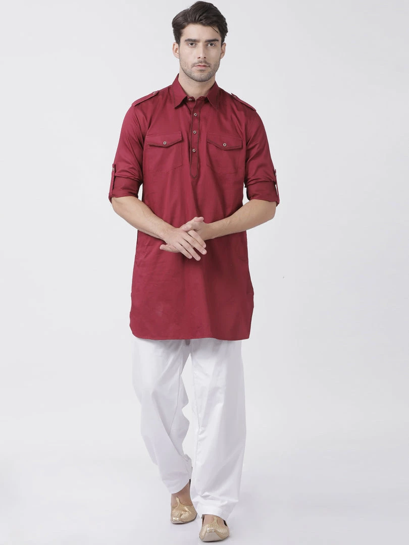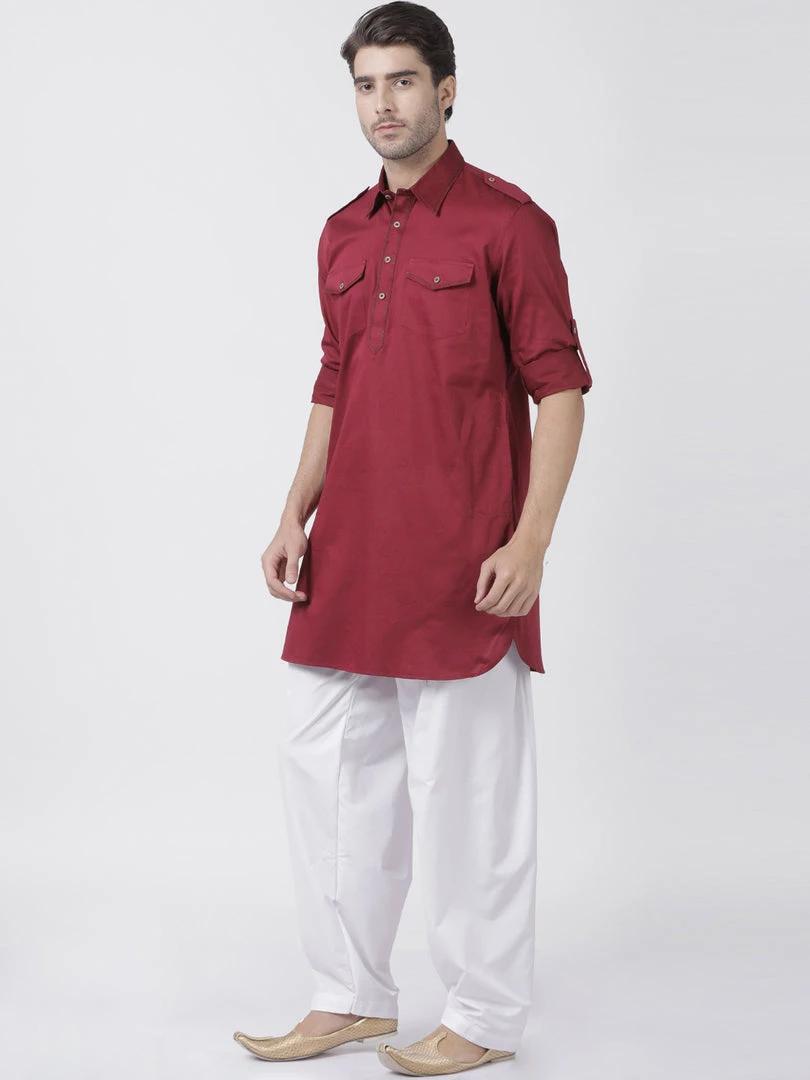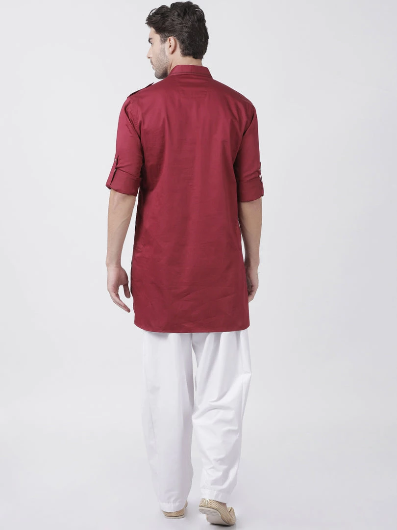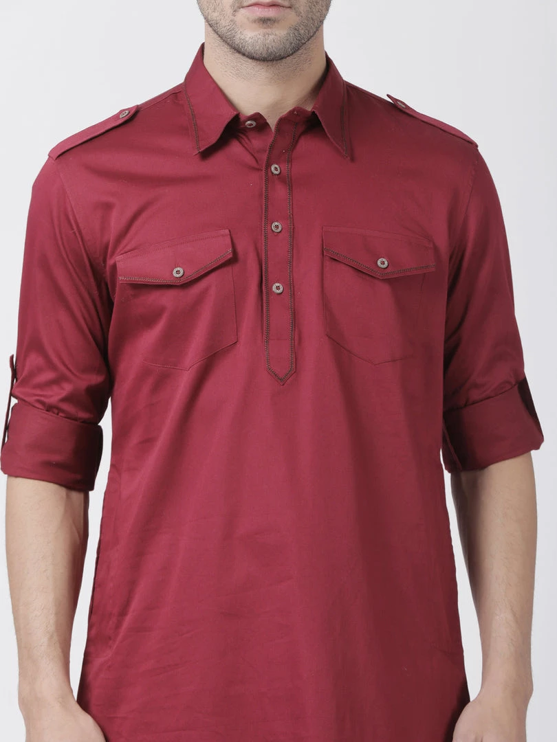 Maroon solid straight above knee length kurta, has a shirt collar, button placket, long sleeves, two pockets and curved hem