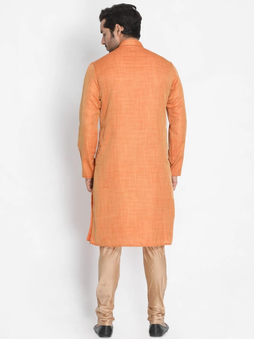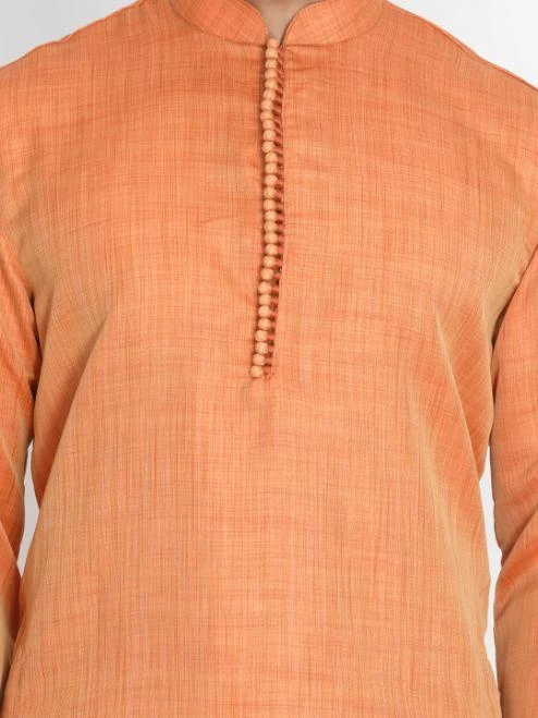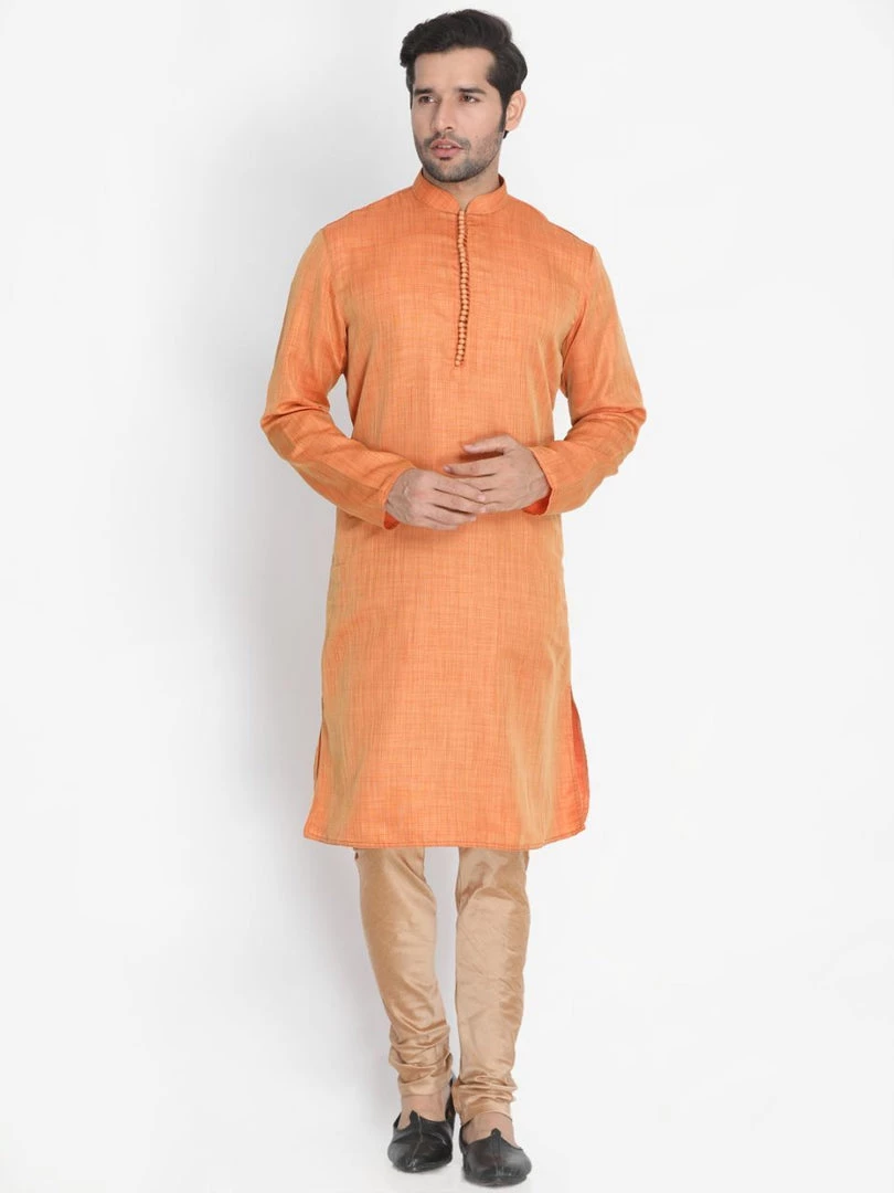 Orange solid straight knee-length kurta, has a mandarin collar, button placket, long sleeves, straight hem.