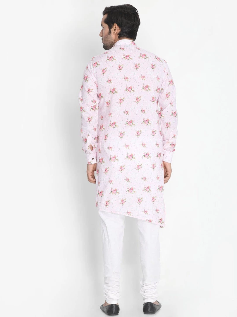 Pink floral printed straight knee-length kurta, has a band collar, button placket on the shoulder, long sleeves, asymmetric hem.