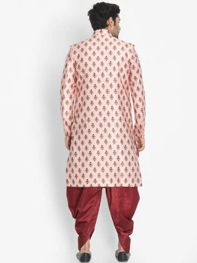 Pink printed sherwani, has a mandarin collar, long sleeves, full front button placket, straight hem, a welt pocket, side slits. Comes with a pocket square