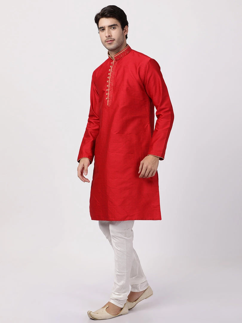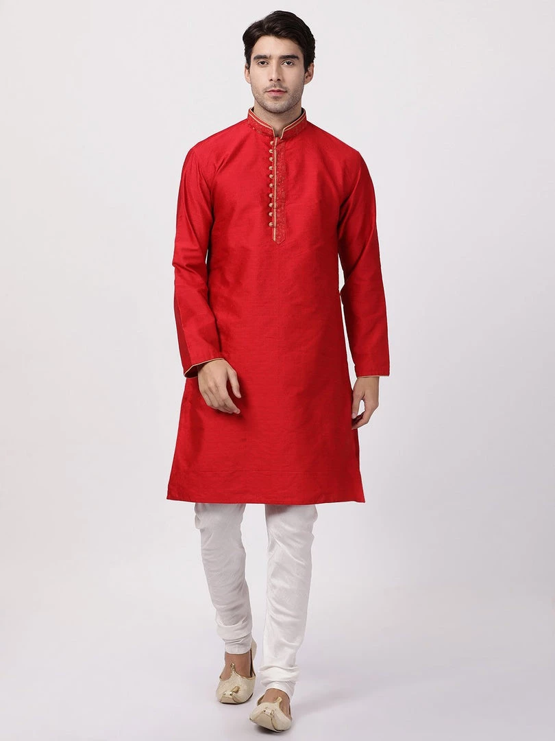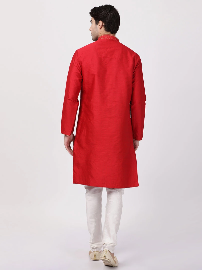 Red solid straight knee-length kurta, has a mandarin collar, button placket, long sleeves, straight hem. Embroidered design on the collar.