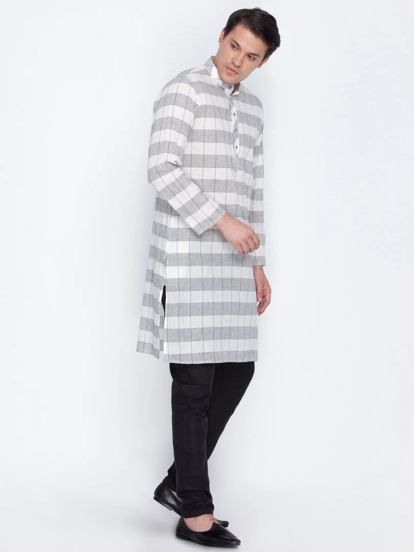 White and grey woven check straight knee length kurta, has a mandarin collar, long sleeves, button placket, straight hem