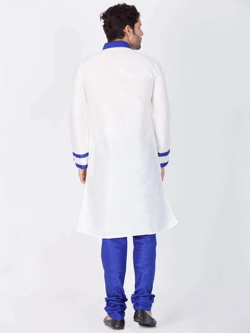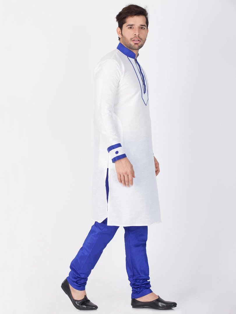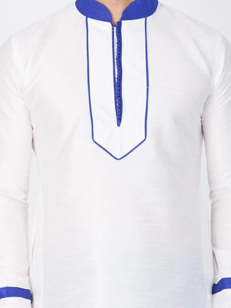 White solid straight knee-length kurta, has a mandarin collar, button placket, blue border on collar and sleeves, long sleeves, straight hem