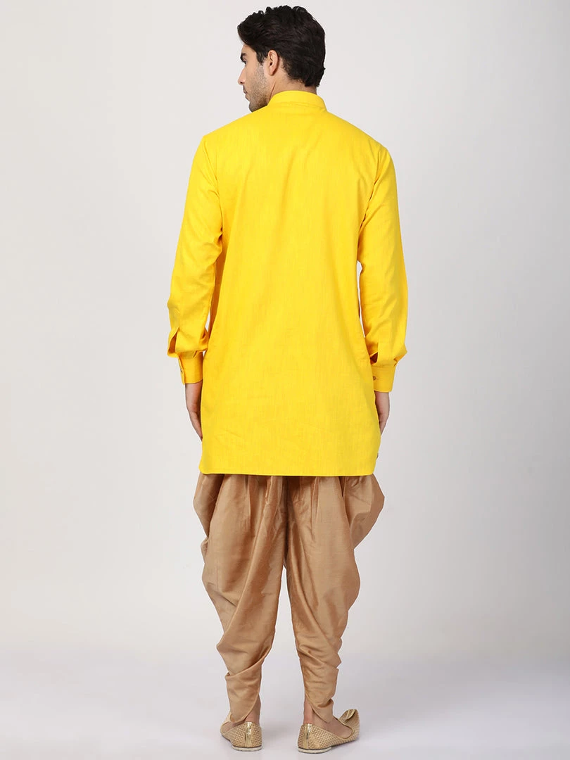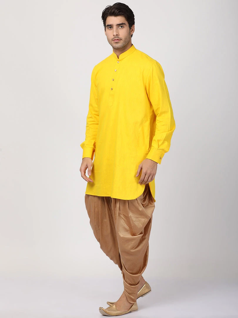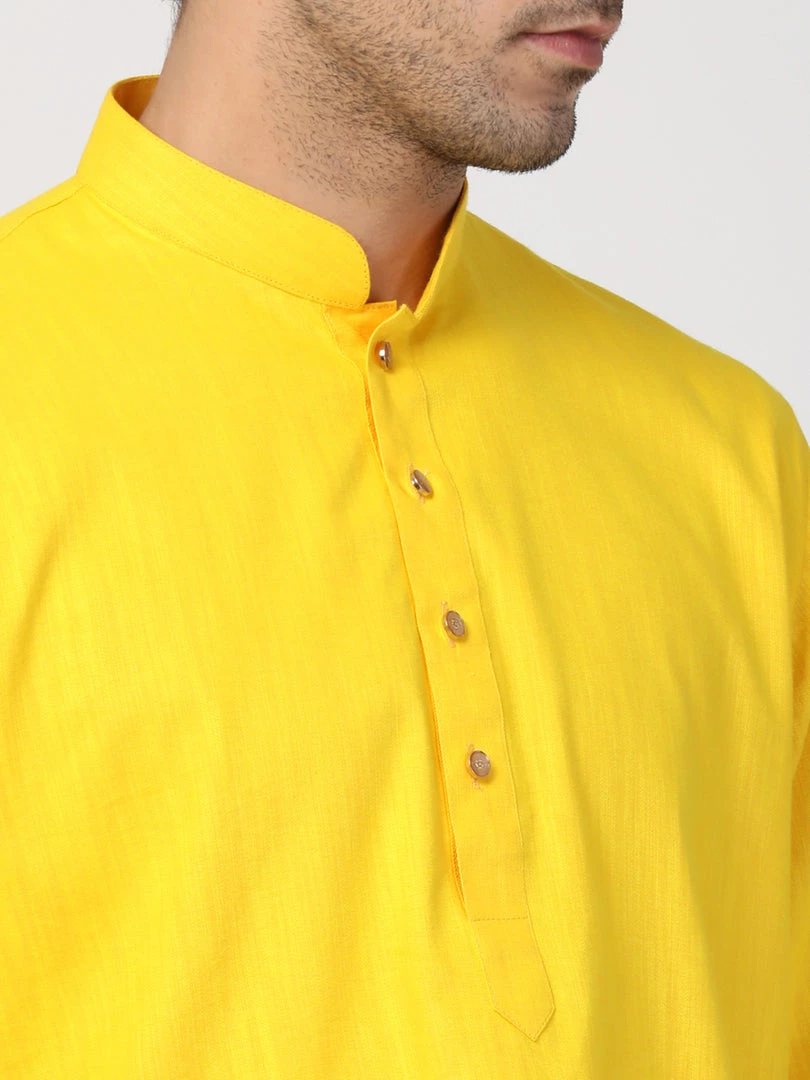 Yellow solid above knee length pathani kurta, has a mandarin collar, long sleeves, button placket, curved hem, side slits