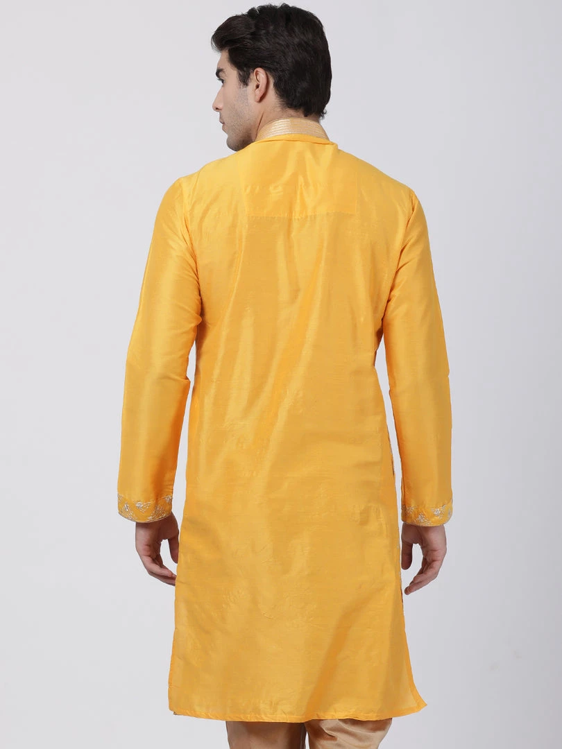 Yellow Embroidered Kurta, Long Sleeve, Straight hem, has a Mandarin Collar, Straight Knee-length, Side slits.